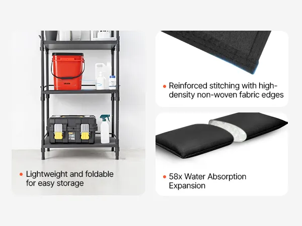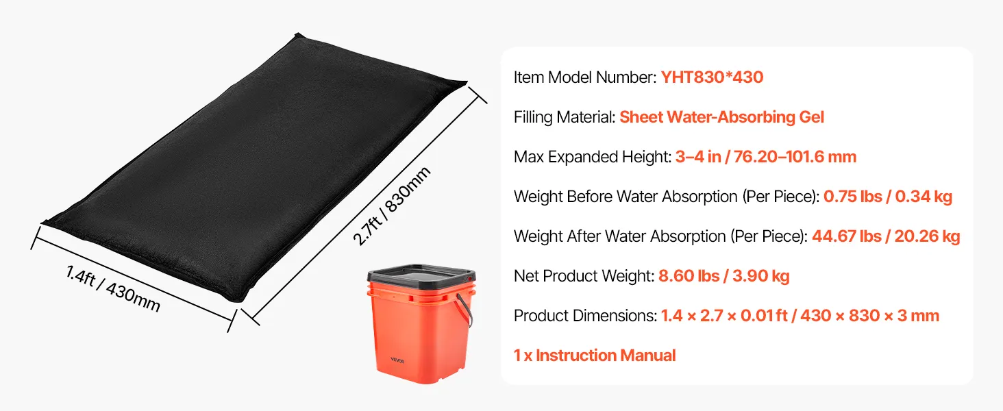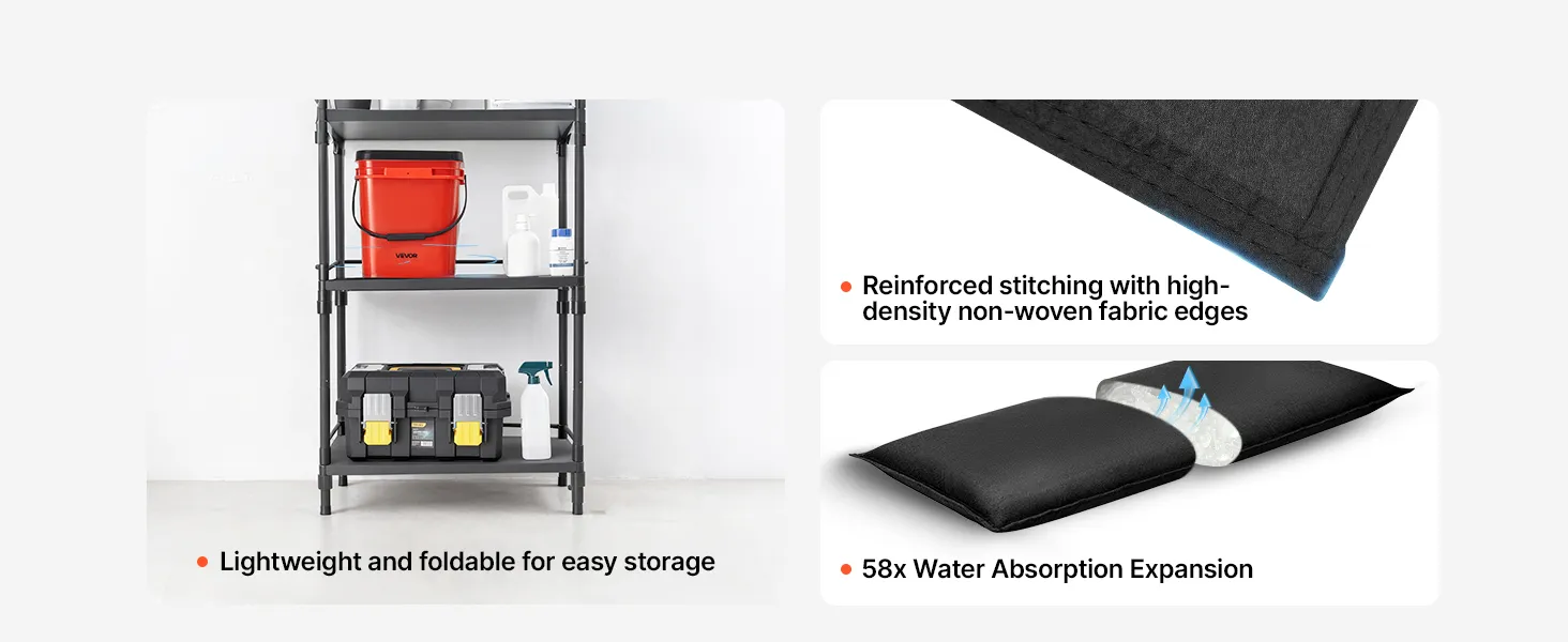 A: 1. Not suitable for fast-flowing water or long-term fixed protection. 2. Works on flat surfaces (concrete/tiles/asphalt); avoid sharp objects. 3. Must be thoroughly dried before storage – drying time varies by climate.