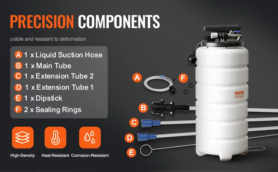 Our comprehensive oil extractor kit includes a main tube, a dipstick, two extension tubes, a liquid suction hose, and two sealing rings – each a precision component ensuring smooth fluid disposal steps.
