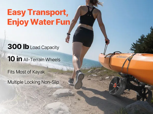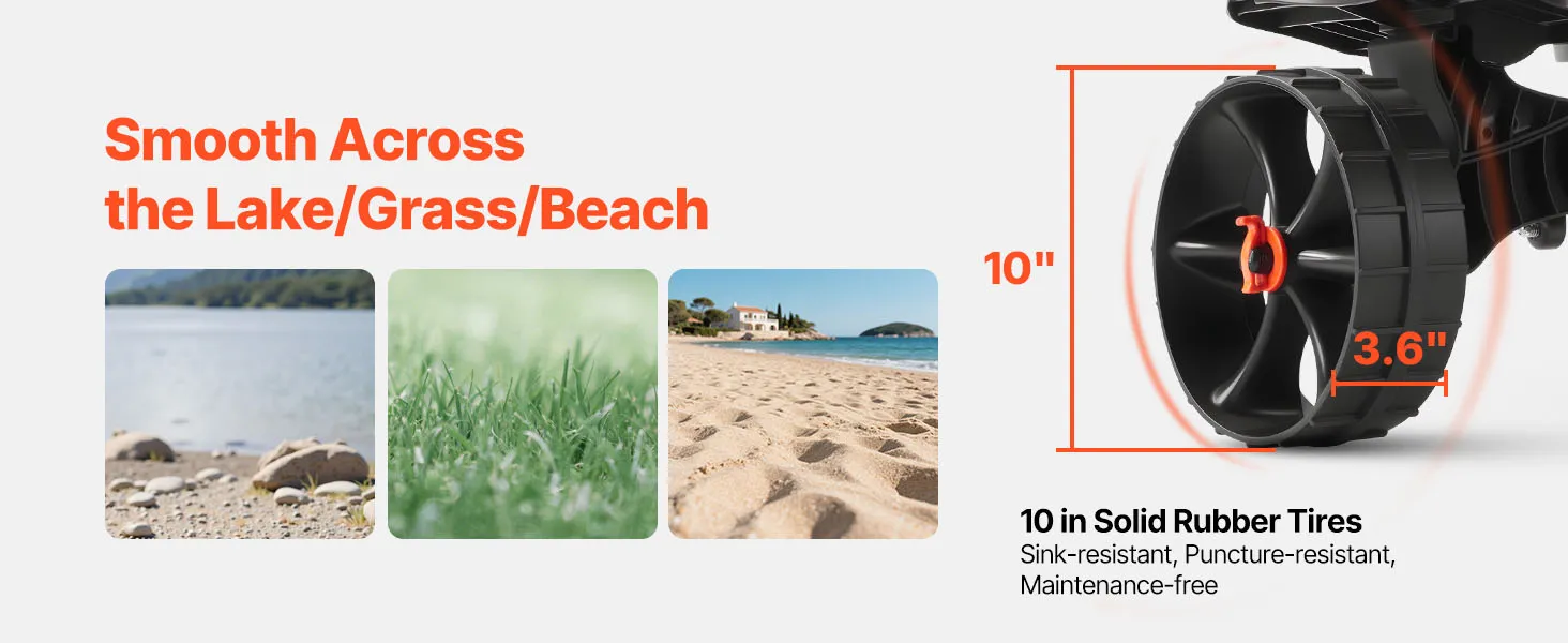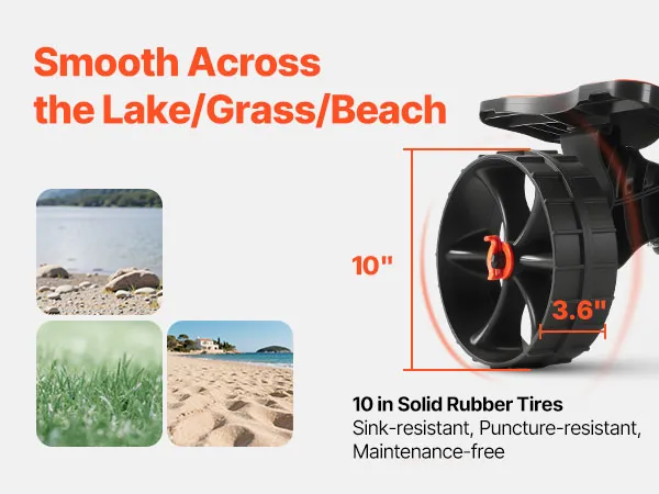 • Smooth Ride: Equipped with 10-inch solid rubber wheels and 3.6-inch wide tires, this kayak roller cart easily glides over sand, gravel, and grass. No air needed – enjoy a hassle-free, maintenance-free experience on any terrain