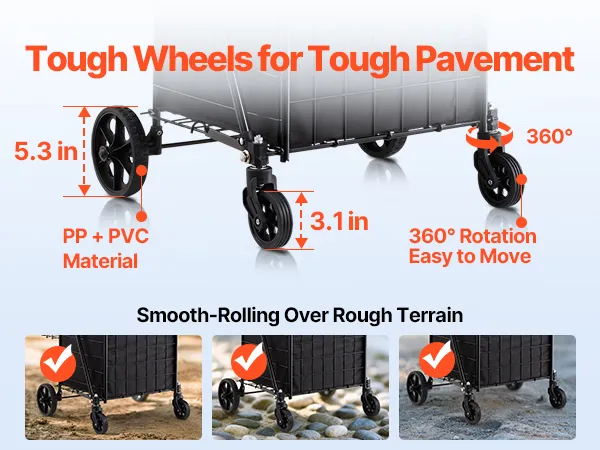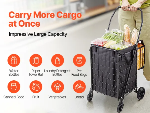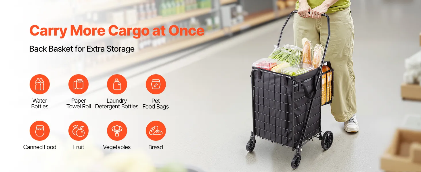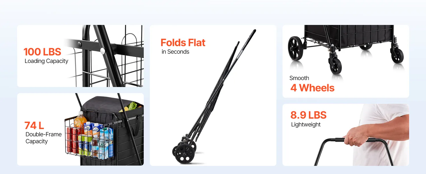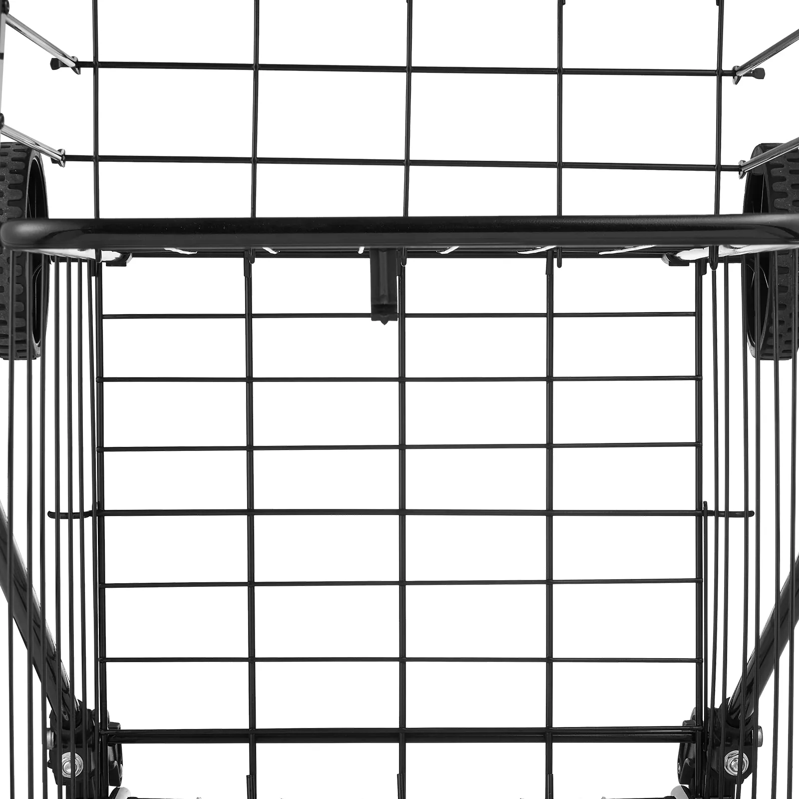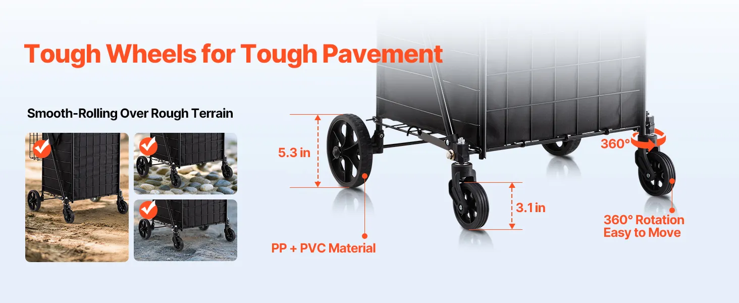 Tired of hauling heavy items repeatedly? This grocery shopping cart supports 100 lbs / 45.3 kg with a sturdy Q195 steel frame. Folds flat for easy storage in a trunk or closet, and large rear wheels roll smoothly over rough surfaces.
