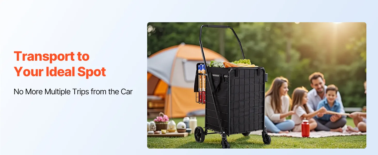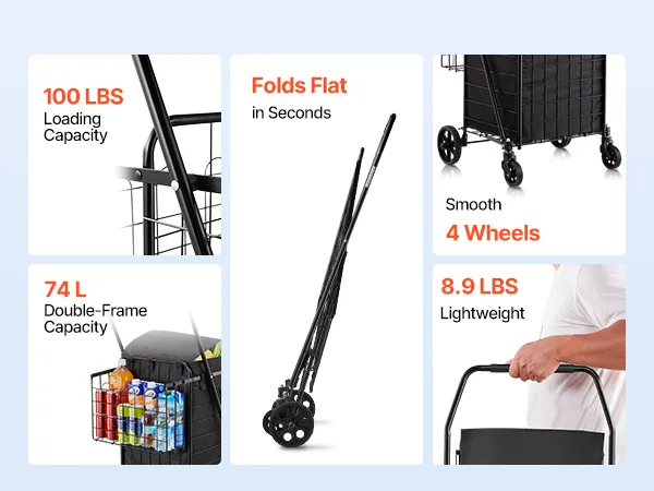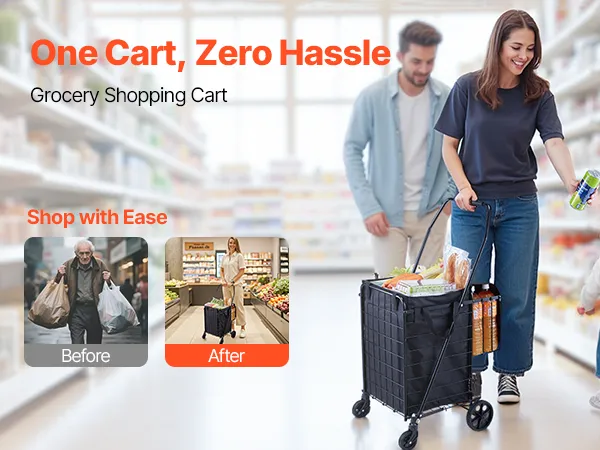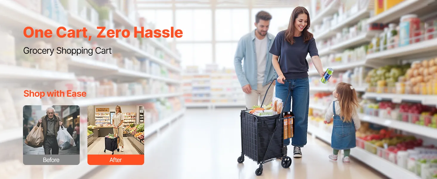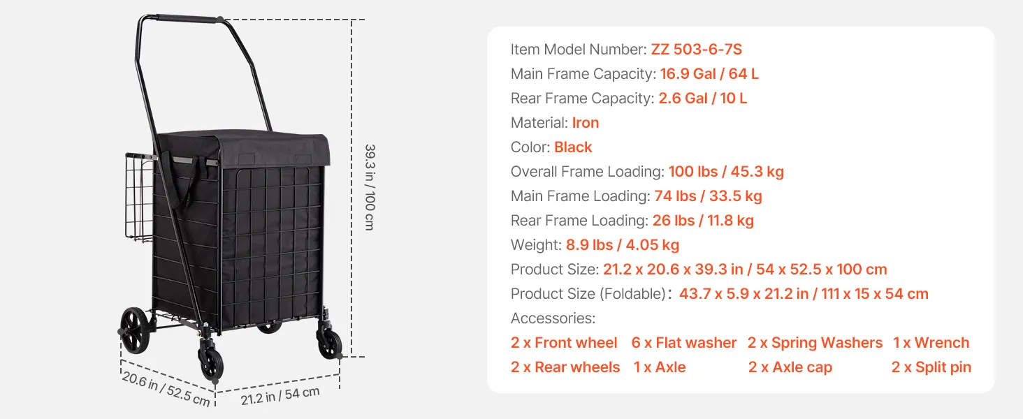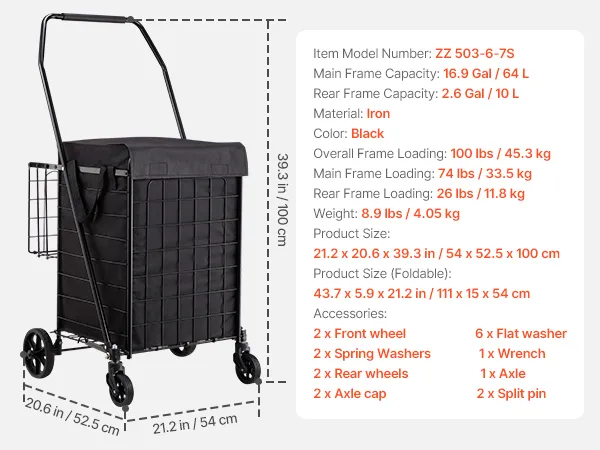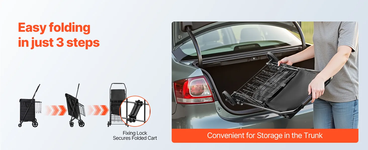 Tired of hauling heavy items repeatedly? This grocery shopping cart supports 100 lbs / 45.3 kg with a sturdy Q195 steel frame. Folds flat for easy storage in a trunk or closet, and large rear wheels roll smoothly over rough surfaces.