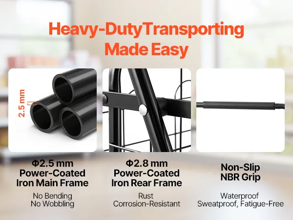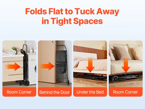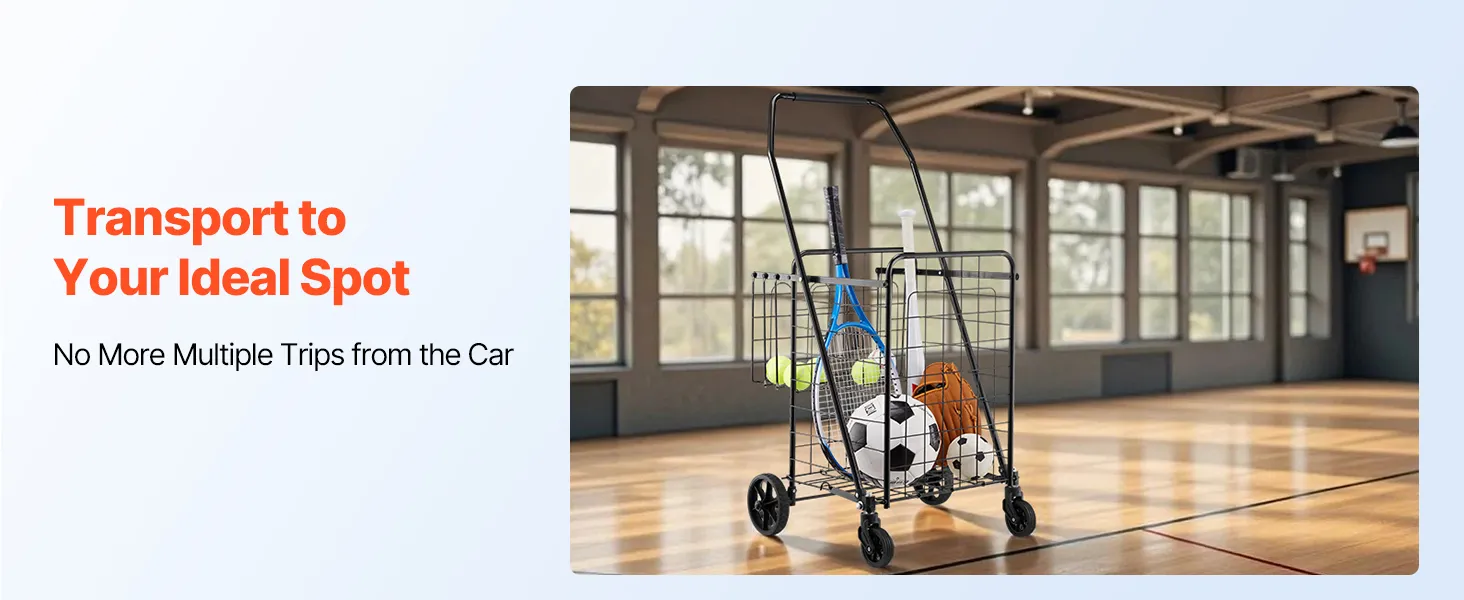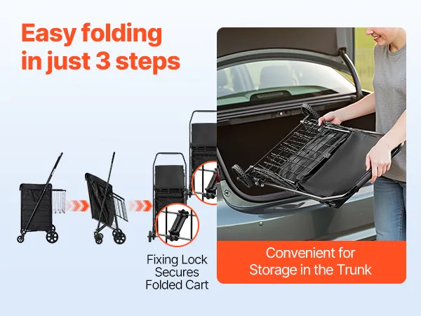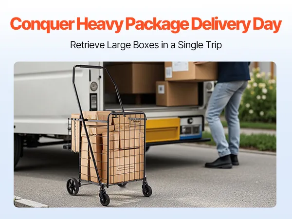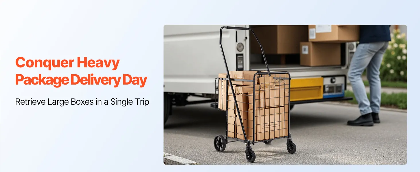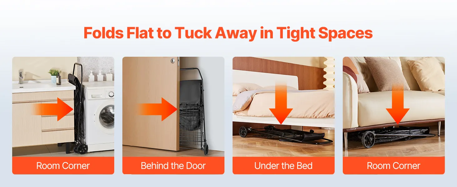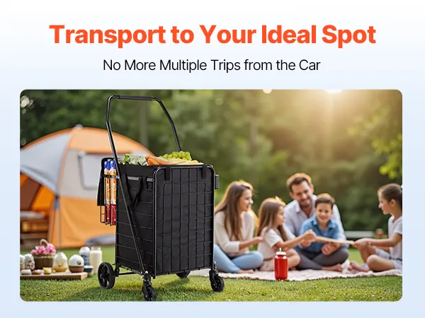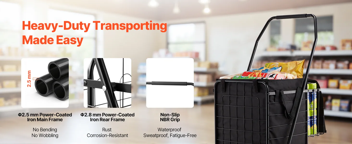 Tired of hauling heavy items repeatedly? This grocery shopping cart supports 100 lbs / 45.3 kg with a sturdy Q195 steel frame. Folds flat for easy storage in a trunk or closet, and large rear wheels roll smoothly over rough surfaces.