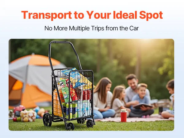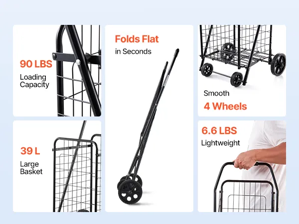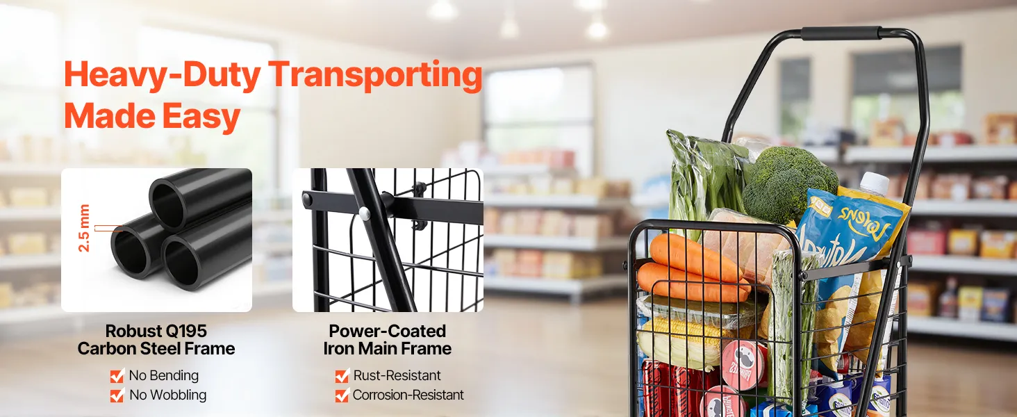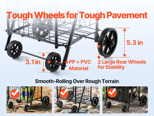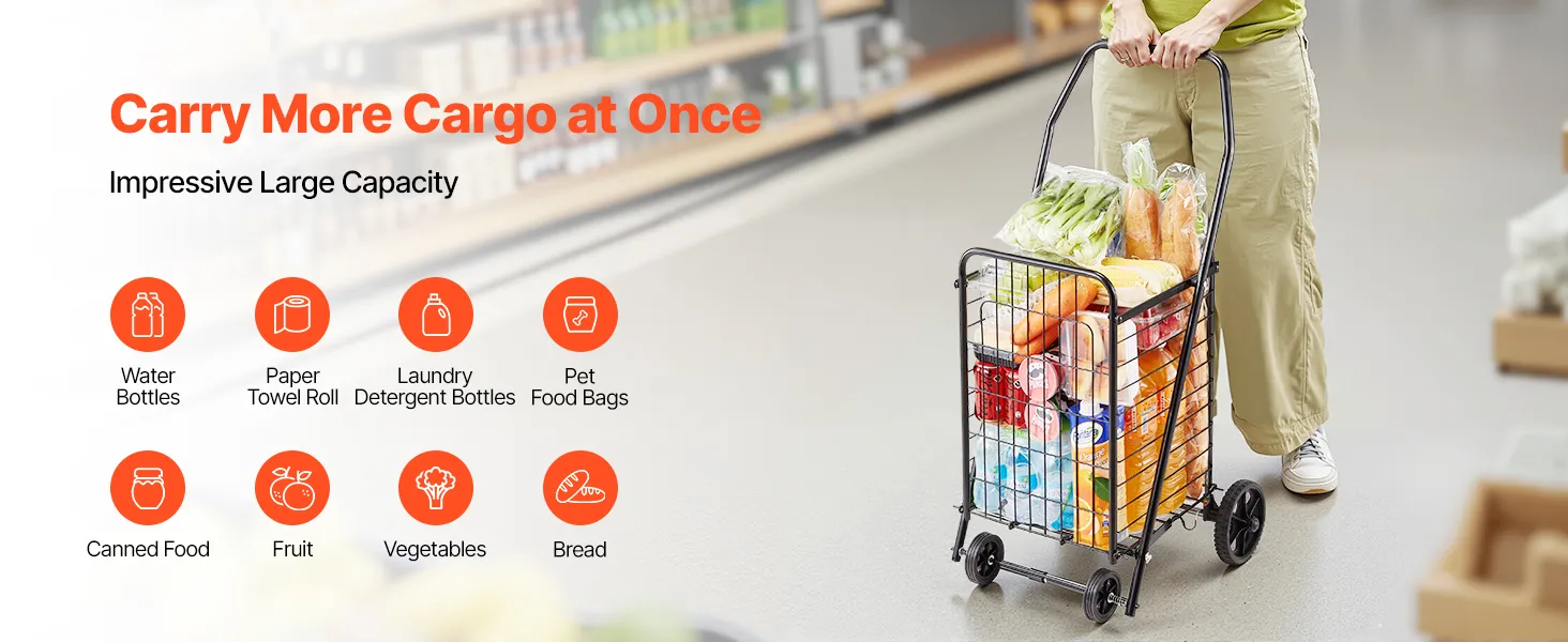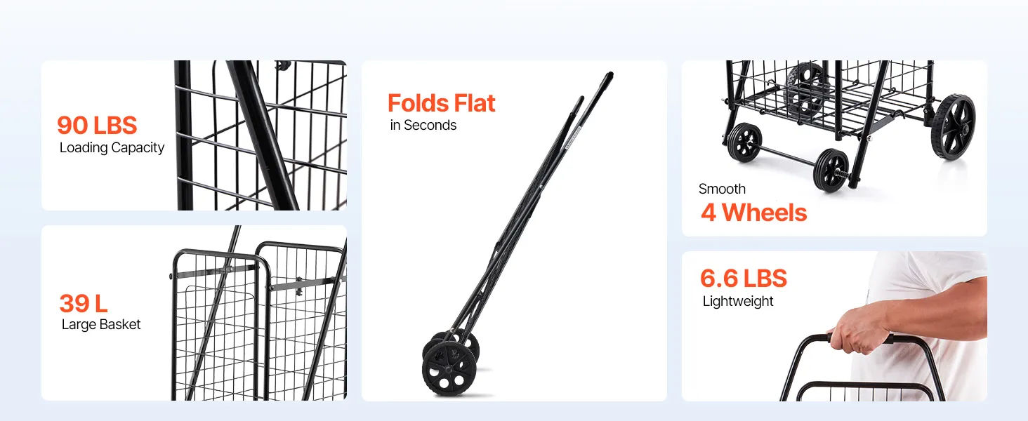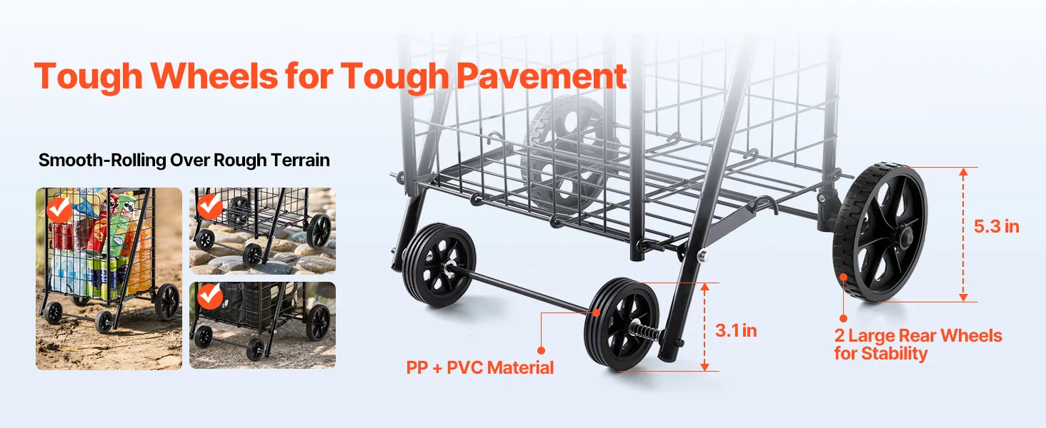 Tired of hauling heavy items repeatedly? This grocery shopping cart supports 90 lbs / 40.8 kg with a sturdy Q195 steel frame. Folds flat for easy storage in a trunk or closet, and large rear wheels roll smoothly over rough surfaces.