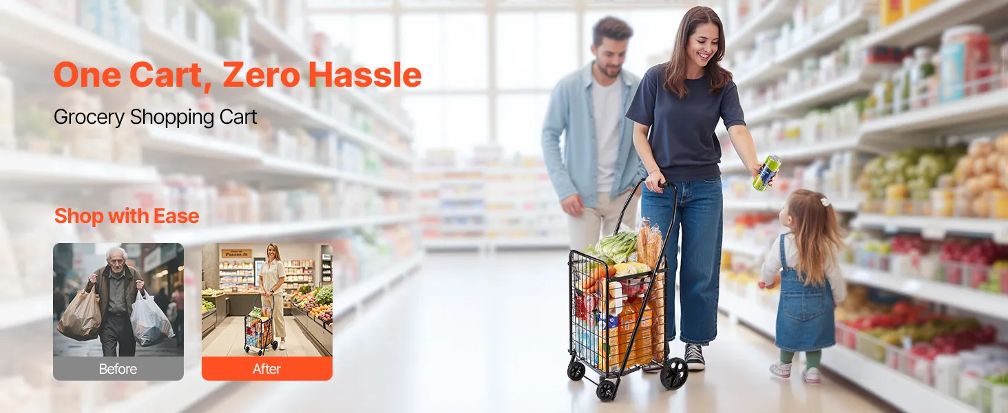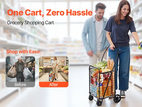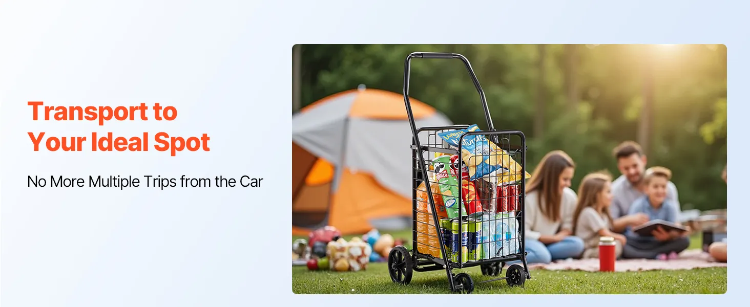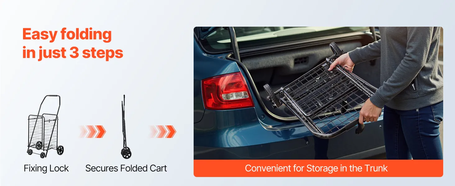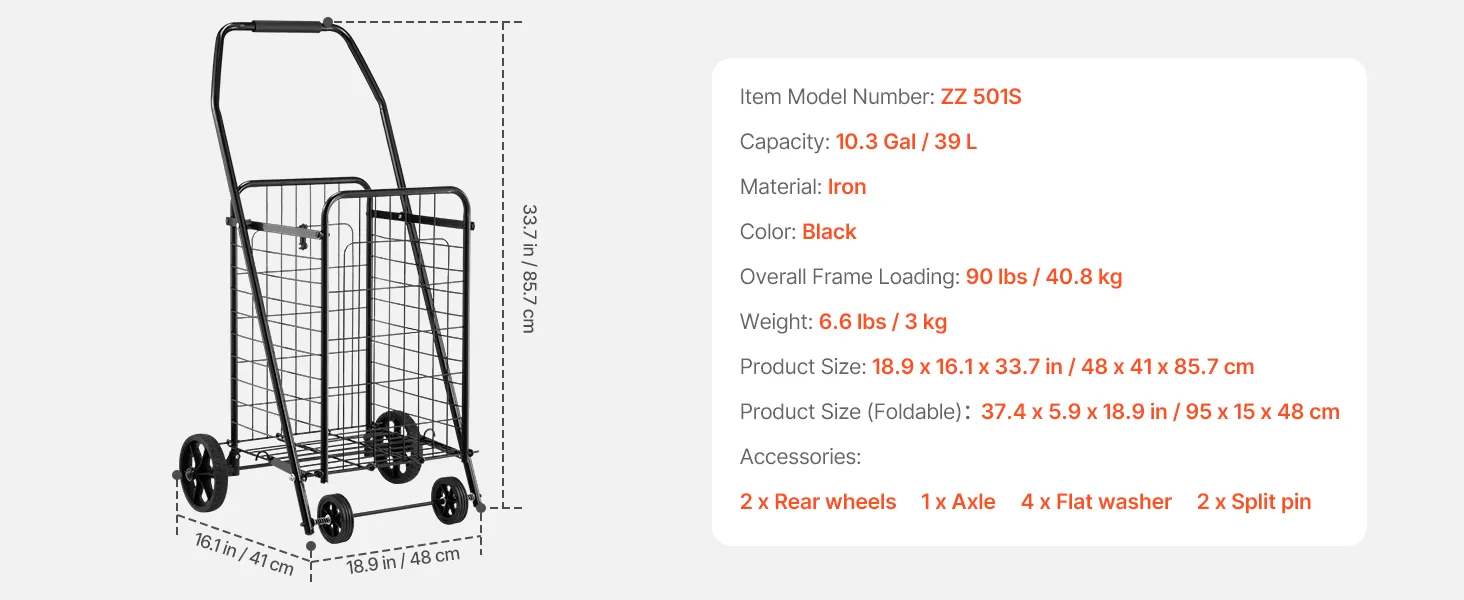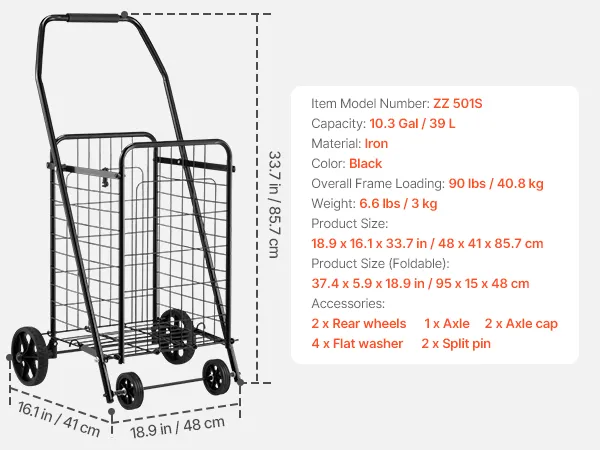 Tired of hauling heavy items repeatedly? This grocery shopping cart supports 90 lbs / 40.8 kg with a sturdy Q195 steel frame. Folds flat for easy storage in a trunk or closet, and large rear wheels roll smoothly over rough surfaces.