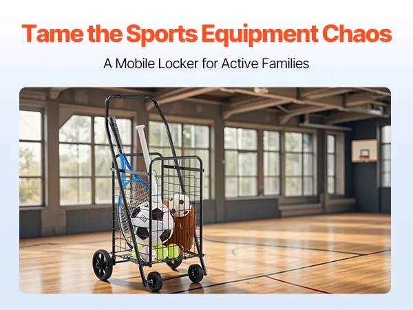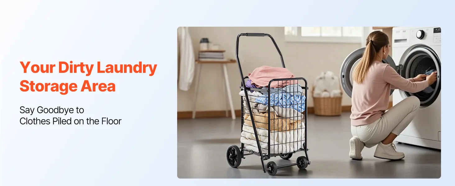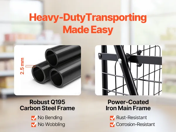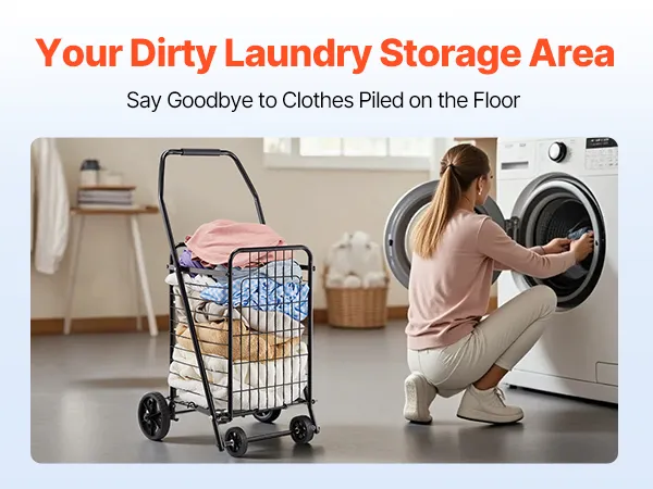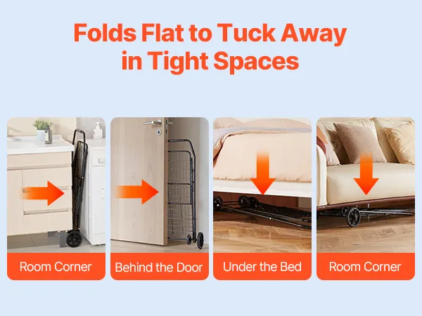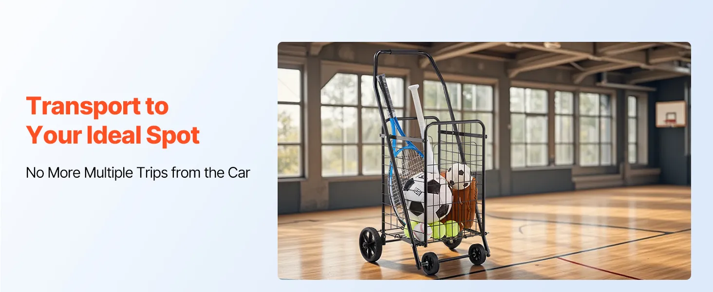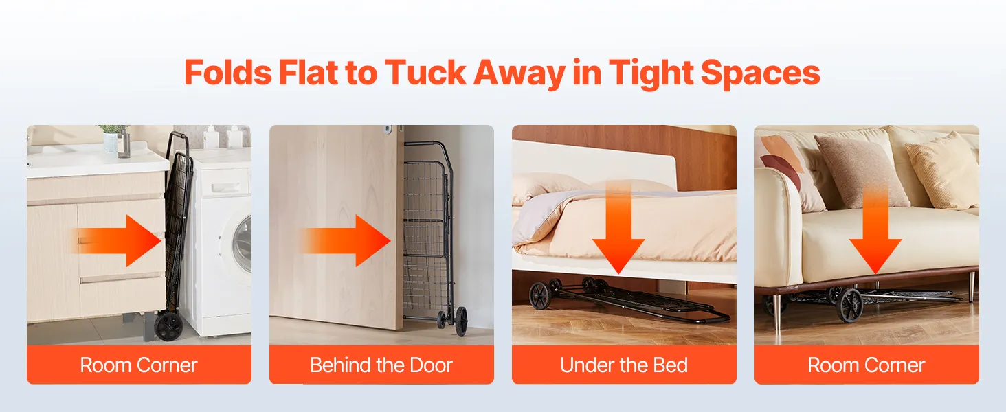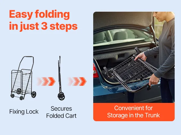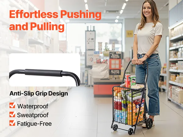 Tired of hauling heavy items repeatedly? This grocery shopping cart supports 90 lbs / 40.8 kg with a sturdy Q195 steel frame. Folds flat for easy storage in a trunk or closet, and large rear wheels roll smoothly over rough surfaces.