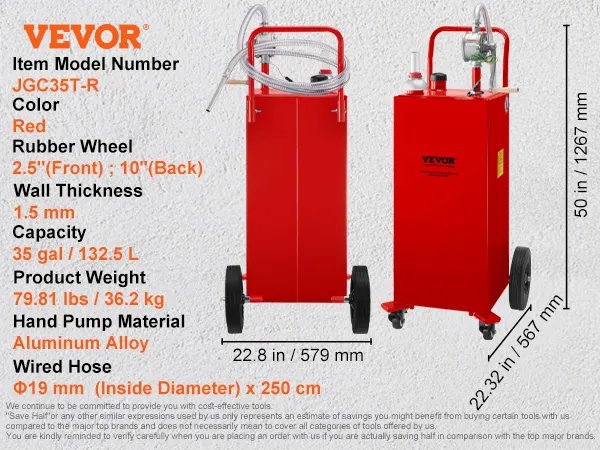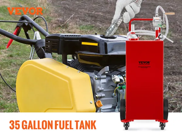 VEVOR Fuel Caddy, 132.49 Liter, Gas Storage Tank on 4 Wheels, with Manuel Transfer Pump, Gasoline Diesel Fuel Container for Cars, Lawn Mowers, ATVs, Boats, More, Red