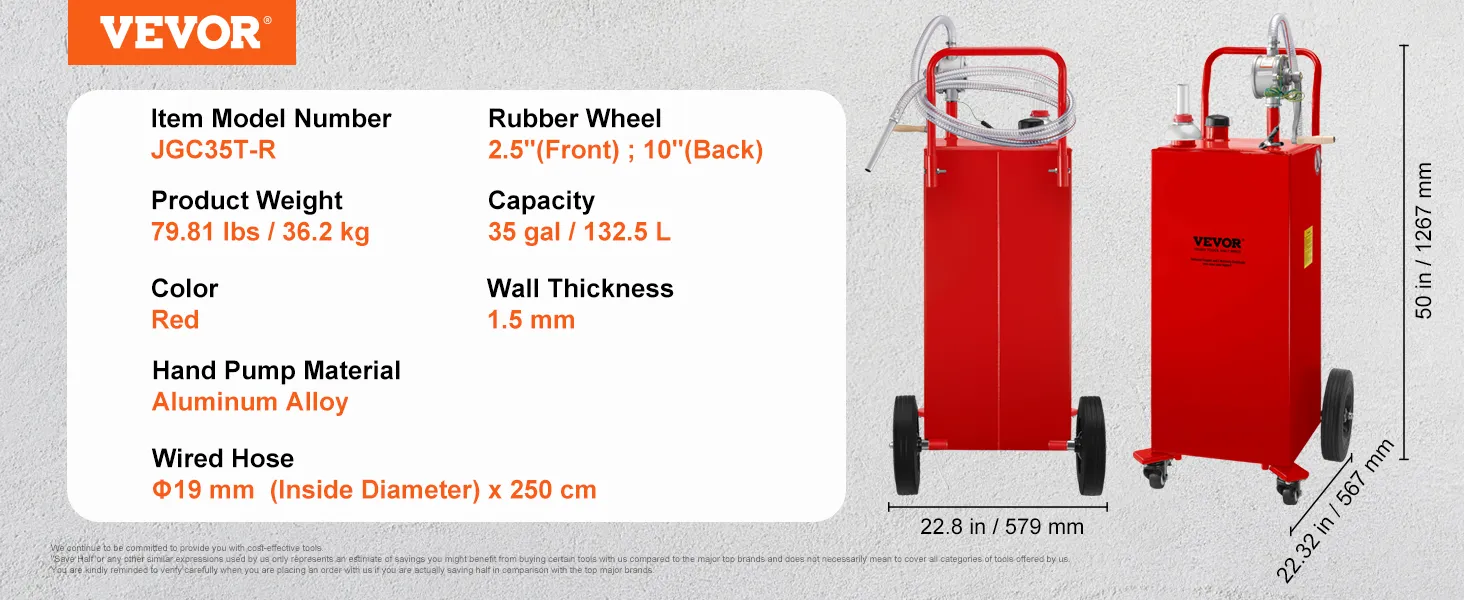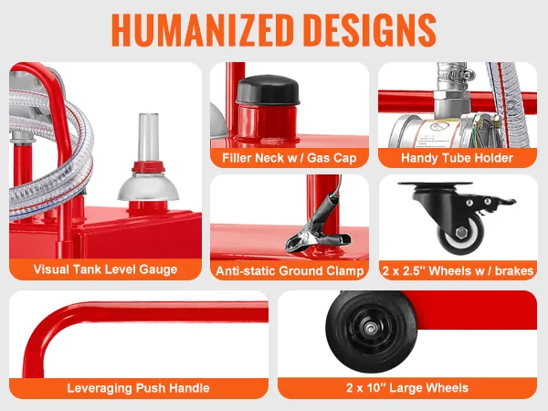 The gas caddy has a premium structure. It includes 10" large wheels and 2.5" small wheels, an anti-static ground clamp, filler neck with gas cap, handy tube holder, and an easy leverage push handle.All these designs will support efficient and secure work.