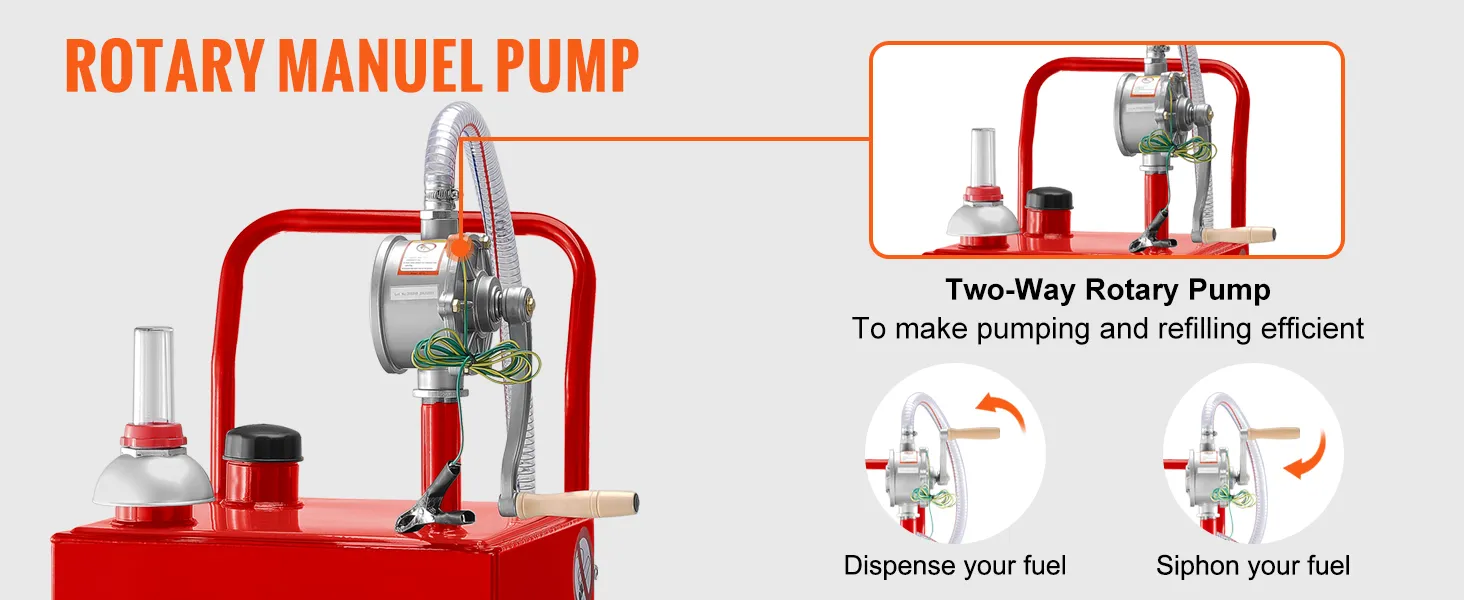The efficient bi-directional pump dispenses or siphons fuel by changing the rotation of the crank handle, allowing you to eliminate overfilling tanks by pulling excess gas or diesel back into the caddy.
