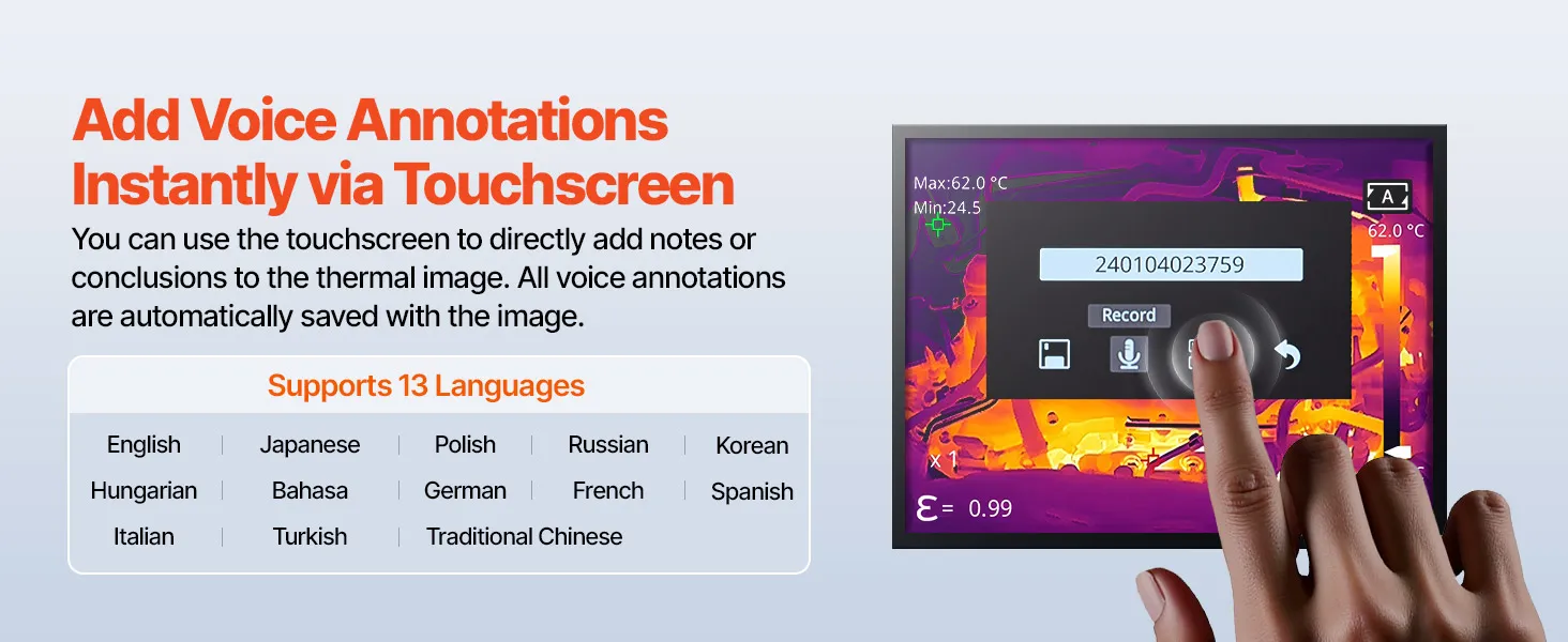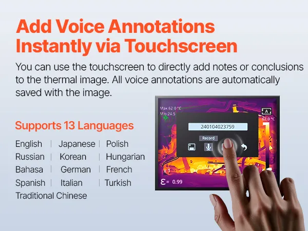 This thermal imager features a 384x288 IR resolution display, providing clear thermal images to spot hidden issues before they escalate. After capturing a photo, you can add notes directly on the 3.5-inch touchscreen for easy documentation and organization.