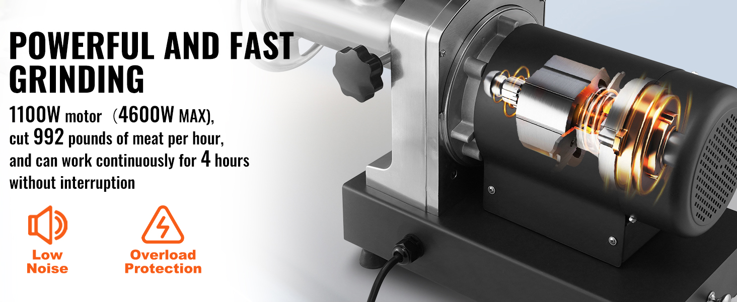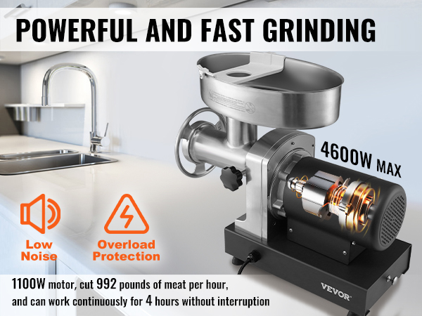 This meat grinder has a peak output of 4600 watts and a rated power of 1100. It can grind up to 992 pounds of meat per hour! Works continuously for over 4 hours. It is a reliable helper for making ground meat quickly and efficiently at home!