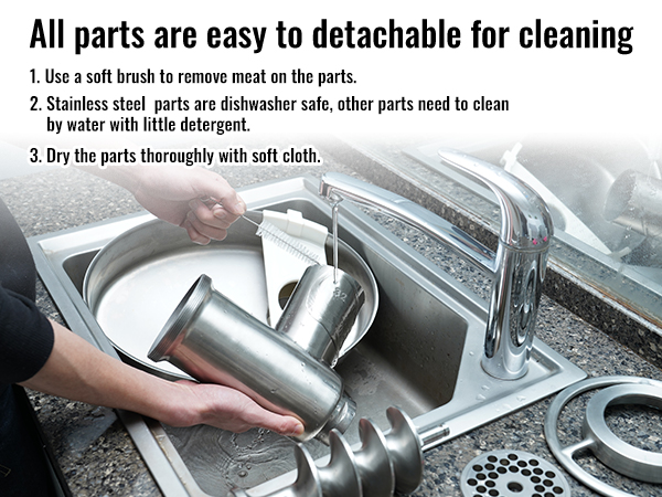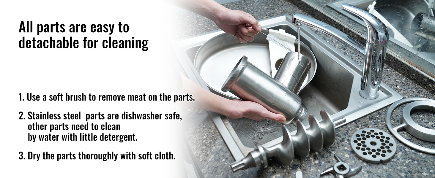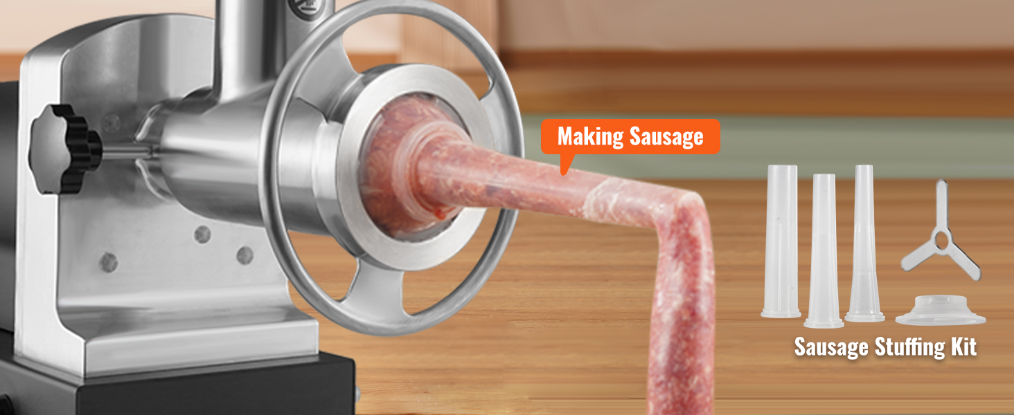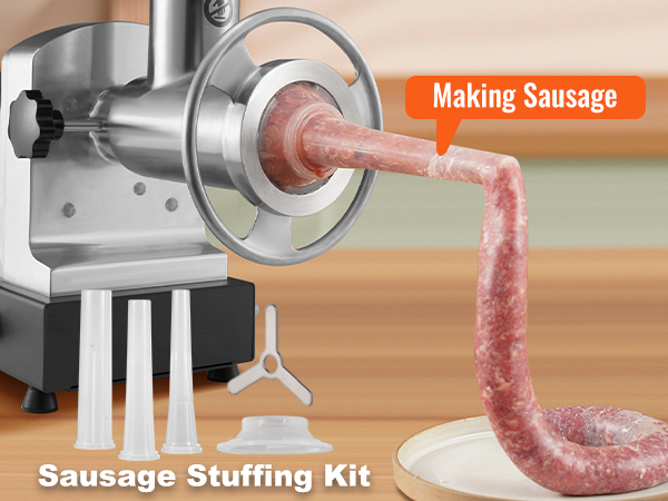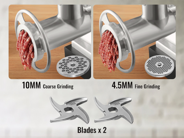 Besides making ground meat, you can also use it to make different kinds of sausages. Include 2 stainless steel cutting plates for coarse and fine meat grinding, 3 sizes of sausage stuffing tubes along with the plate and one cleaning brush.