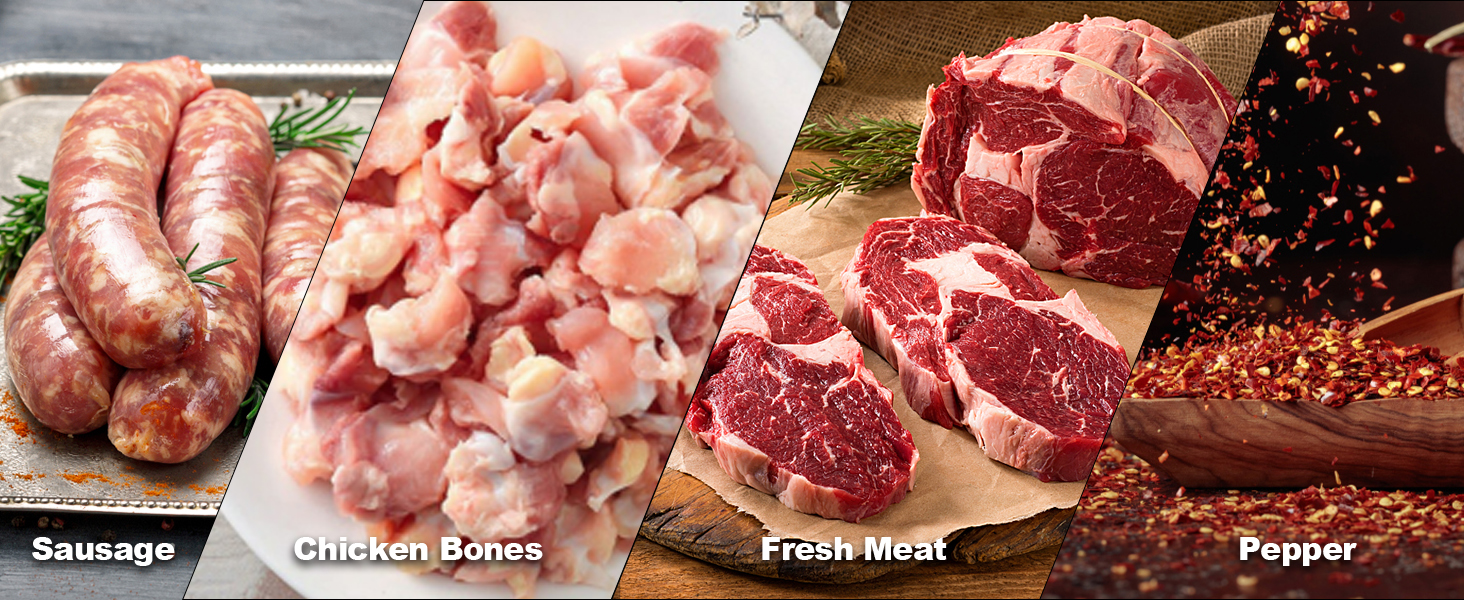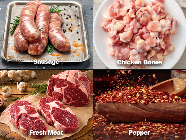 This meat grinder is equipped with power up to 1100W (4600W Max) and can grind all types of meat: beef, chicken, turkey, bison, venison, and other meats. Or use the included sausage accessories to make delicious homemade sausages.