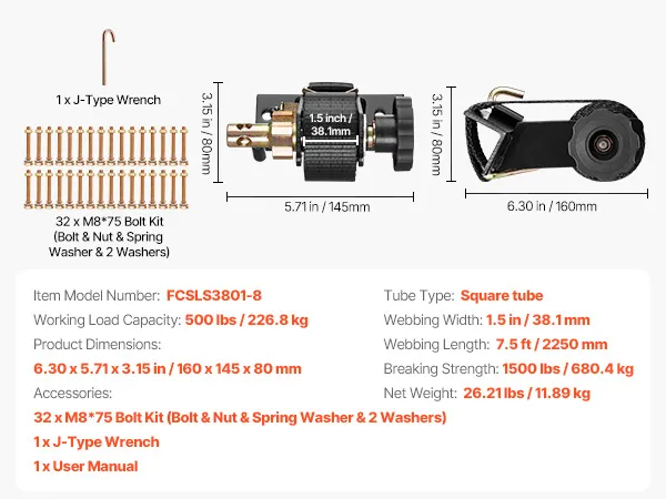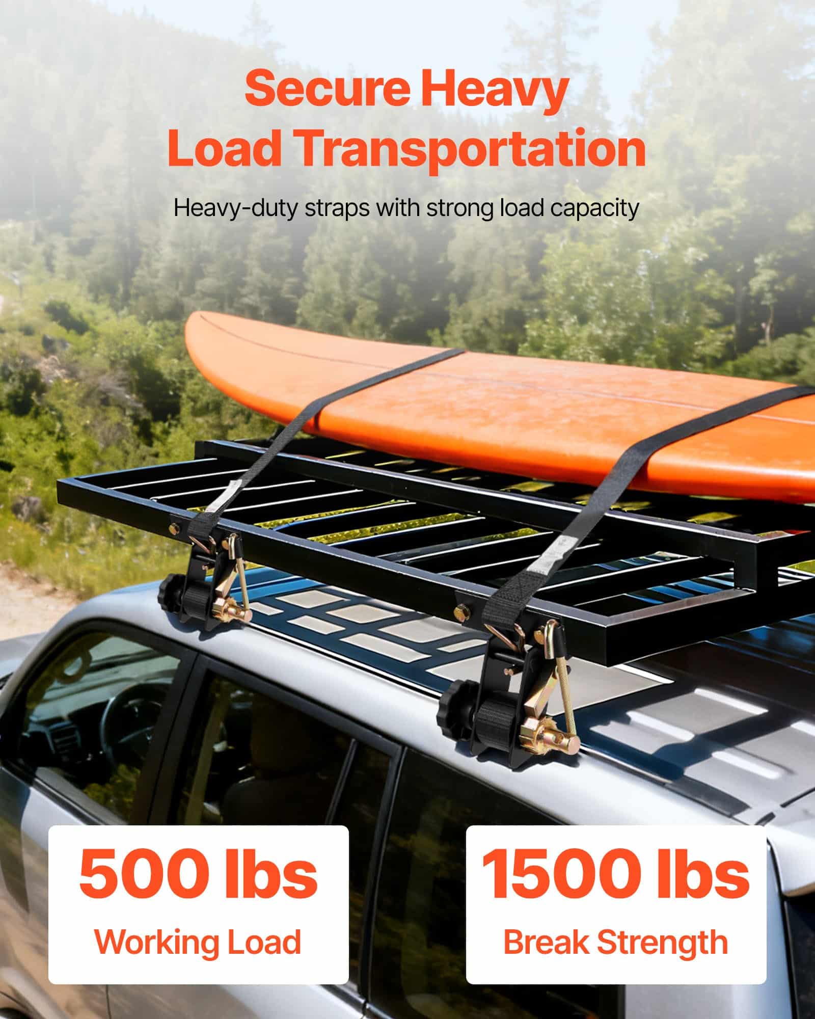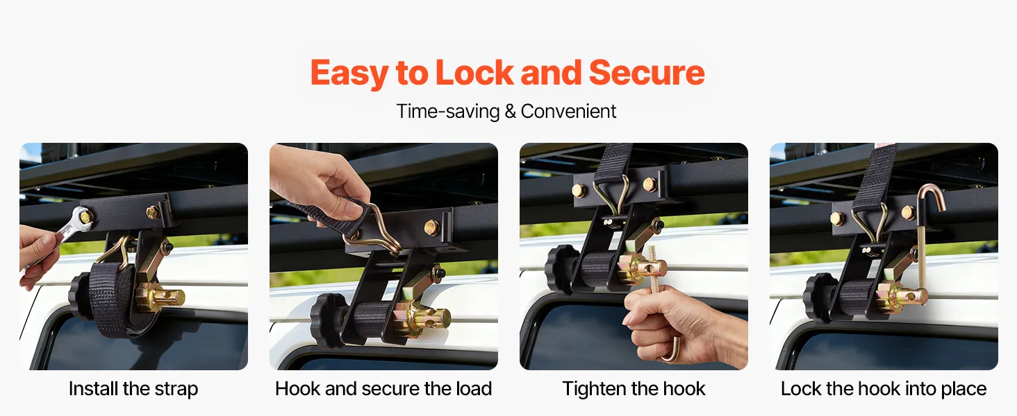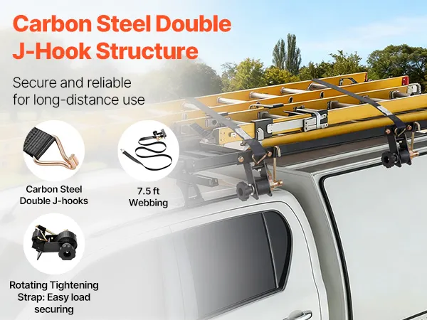 Ці ремені з храповиком для стійки для драбини витримують робоче навантаження 500 фунтів та розривне навантаження 1500 фунтів. Вони допомагають надійно закріпити довгі драбини або важке спорядження на багажнику на даху для більш стабільного транспортування по шосе.