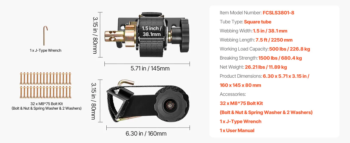 VEVOR Ladder Rack Ratchet Straps, Black Square Tube Mount, 38 mm Wide x 2.25 m Long Black Ladder Rack Straps with Double J-Hooks, 226.8 kg Load Heavy Duty, Cargo Buckle Lock Strap (8 Pack)