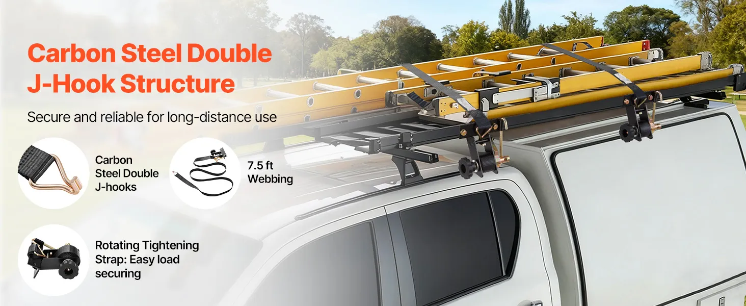 Кожен ремінець для кріплення драбини високої міцності довжиною 7,4 фута має надійну пряжку. Система допомагає запобігти розхитуванню на вибоїстих дорогах і під час руху на швидкості, надійно утримуючи вантаж на місці.