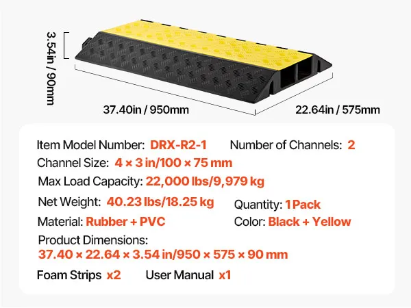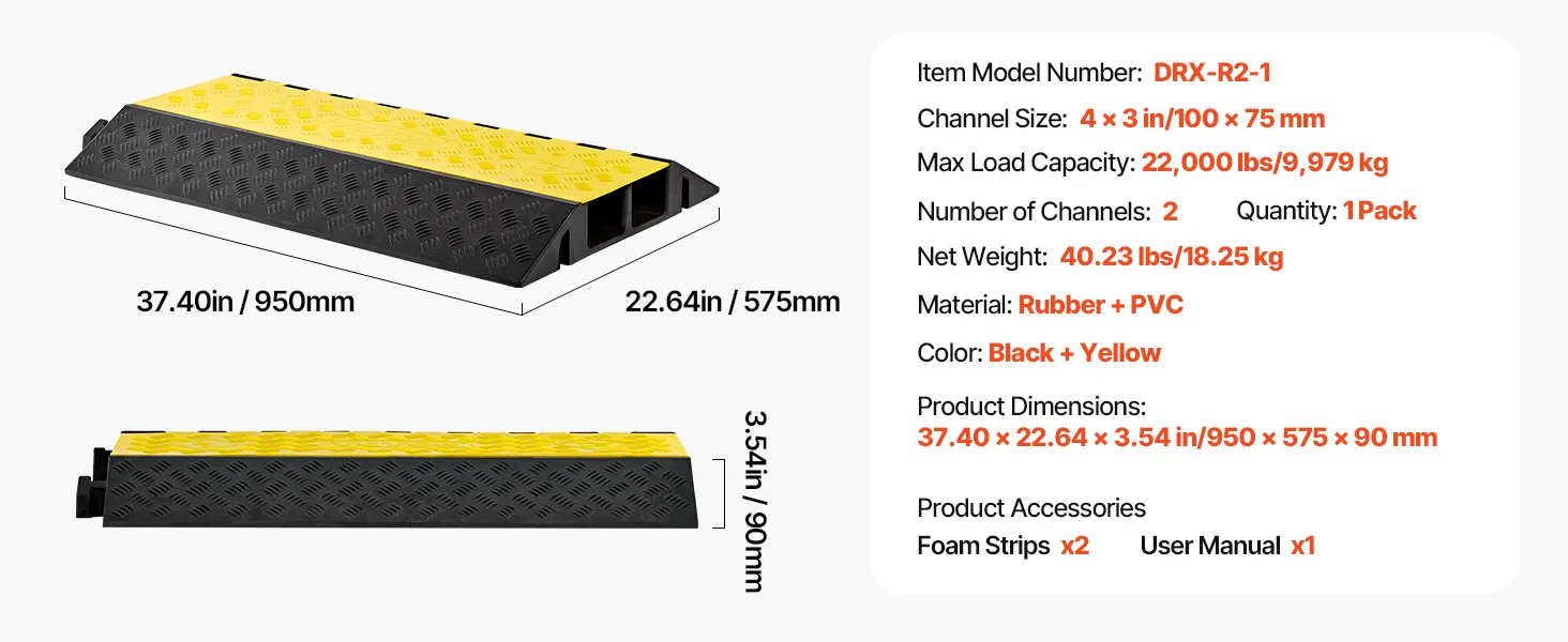 VEVOR Cable Protector Ramp, 9,979 kg/axle Capacity, 2 Channel Heavy Duty Rubber Cord Hose Wire Cover, 100 x 75 mm Channel, Traffic Speed Bump with Flip-Open Top Cover, for Indoor Outdoor Use, 1 Pack