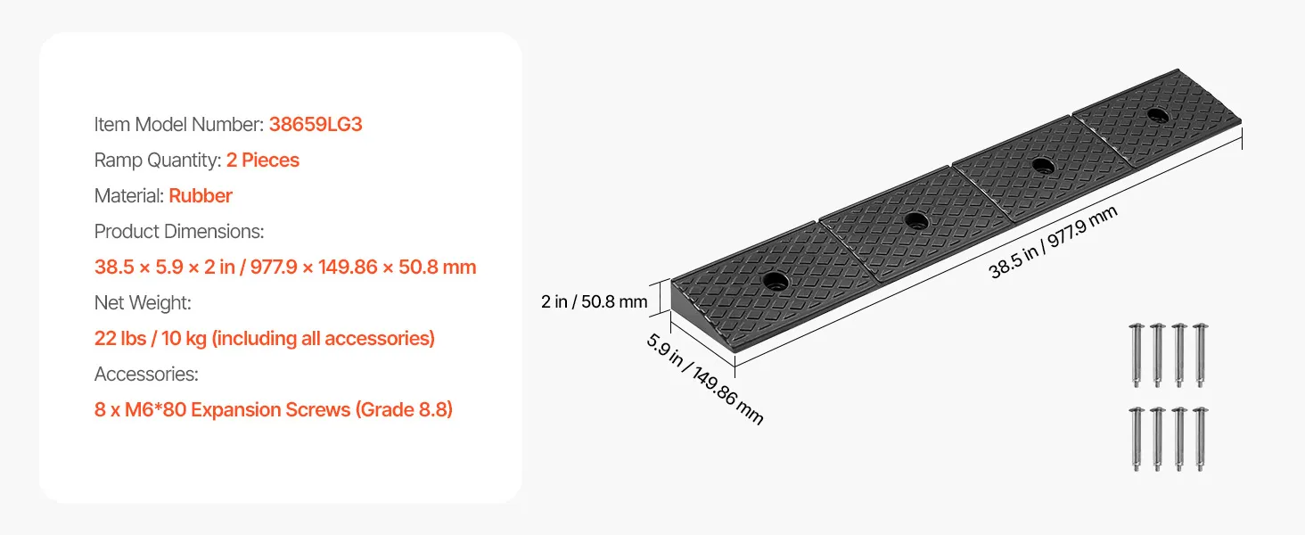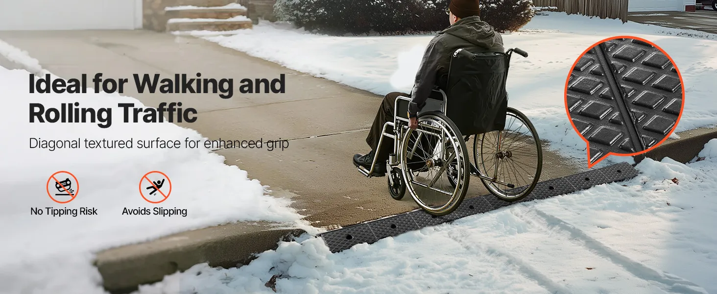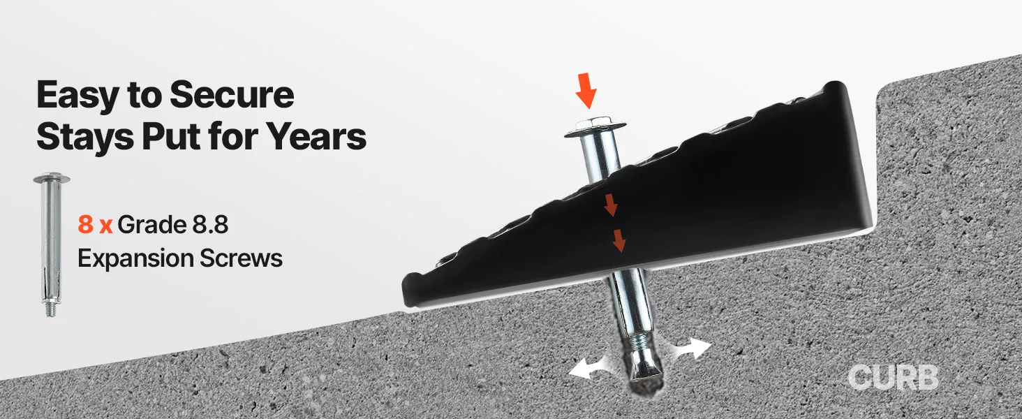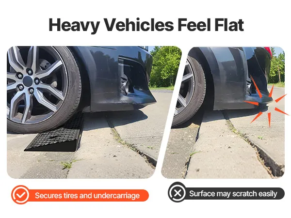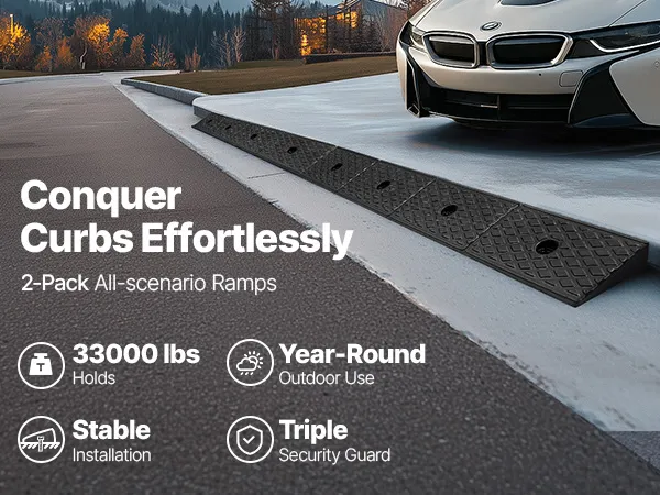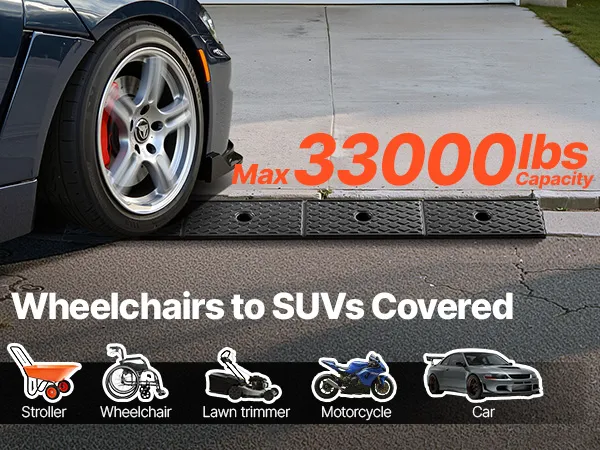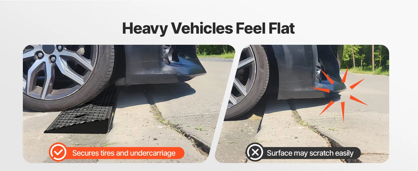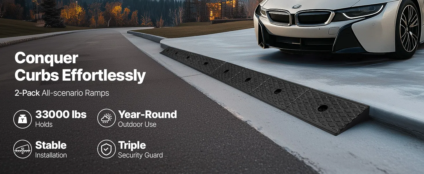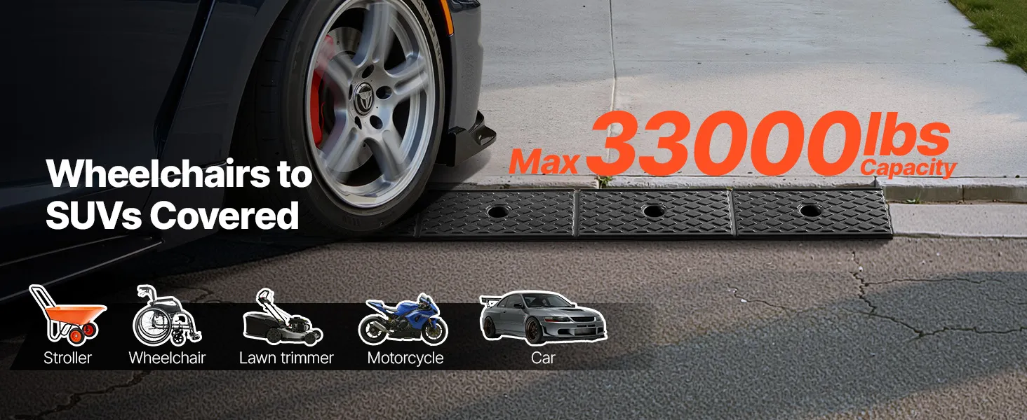 This curb ramp supports up to 15 tons, helping pickups and SUVs enter garages smoothly without tire or undercarriage damage. Curbs and steps feel flat and easy to cross.
