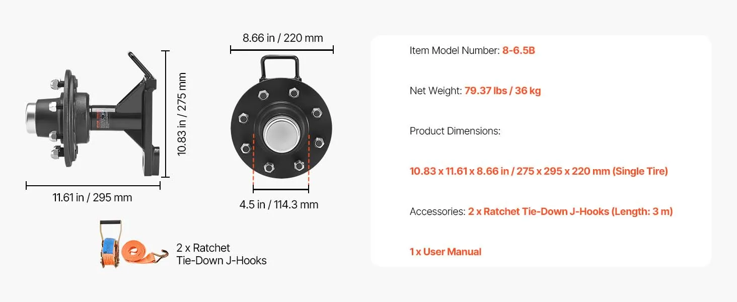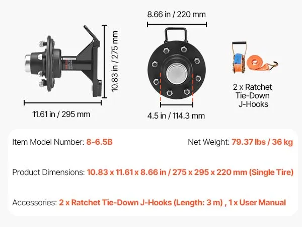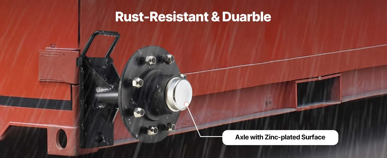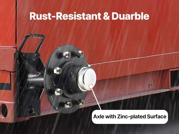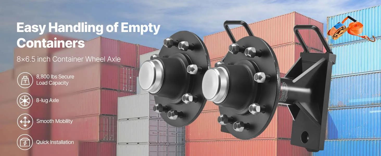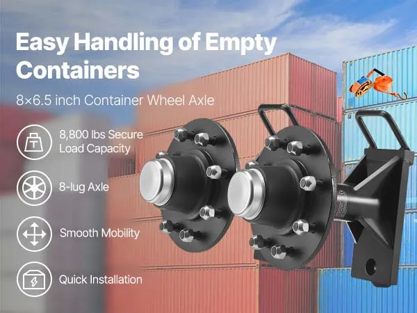 • 8-Lug Axle: The axle features a 6.5 in (165 mm) bolt circle and a 4.5 in (114.3 mm) hub bore. The shipping container wheels kit’s precise design ensures firm installation and fits various shipping container wheels with ease