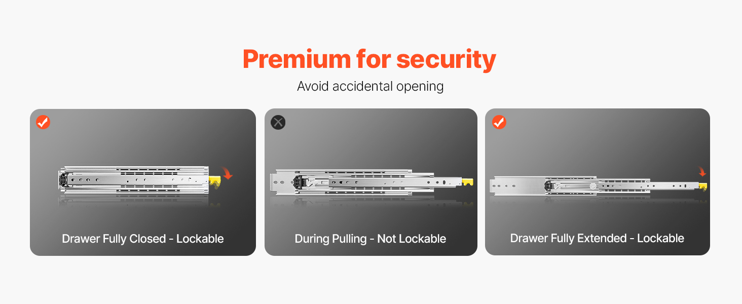 • Secure Lock Design: The full extension dresser drawer slides are equipped with a locking design that locks the slides with a simple press, ensuring that your items are secure and won’t slip off even in bumpy roads.