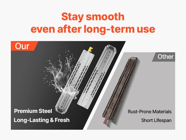 • Gentle & Quiet Lock Slides: These slides feature a locking and latching design that is easy to control. Unlike slides with no lock or only one lock, our lock design provides greater security and stability. Double-row ball bearing provides smooth sliding when closing and opening drawers. Nylon cushioning on center slides is designed to produce less noise and won’t bounce.
