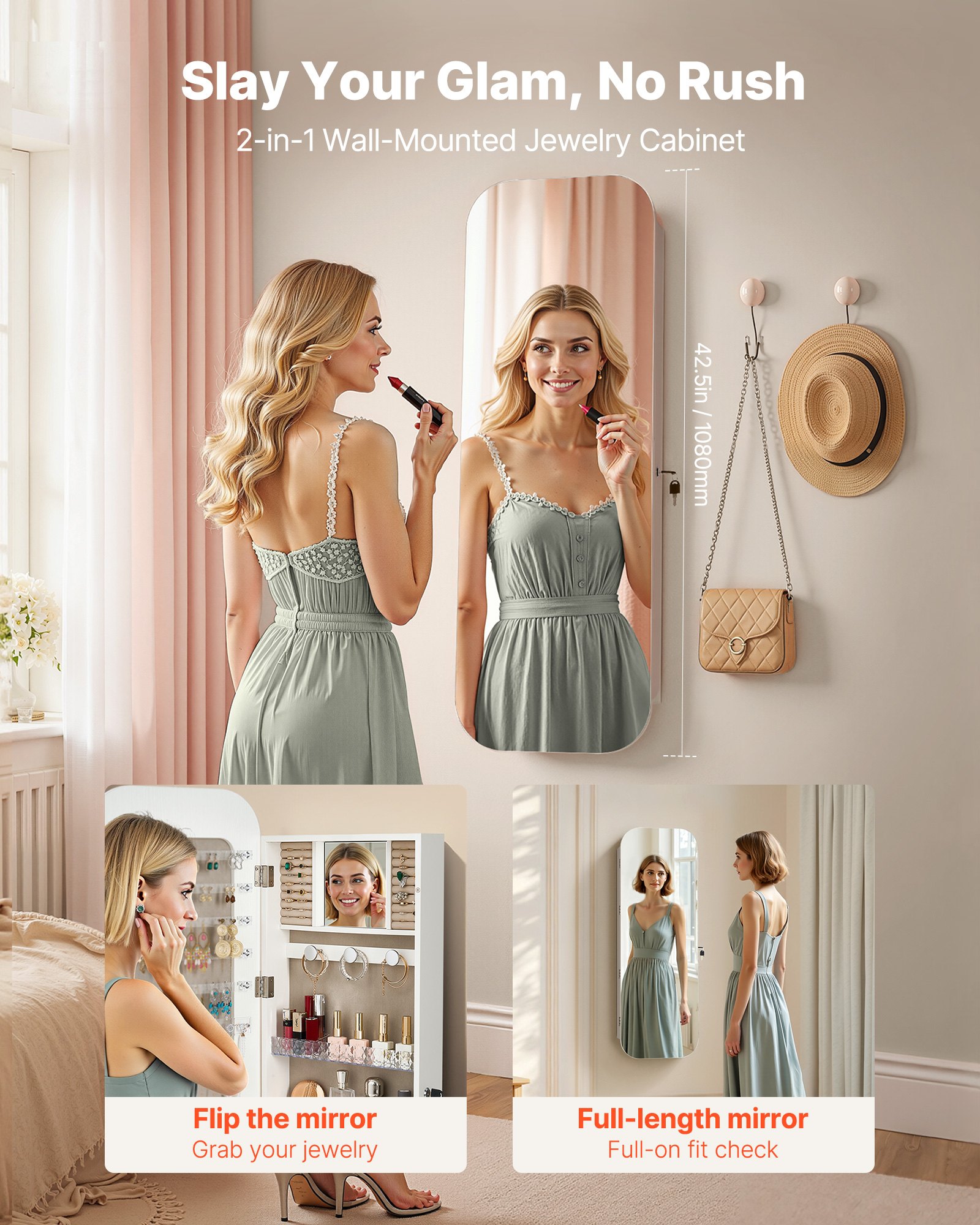 VEVOR Mirror Jewelry Cabinet, 1080 mm Tall, Full-Length Mirror with Storage, Wall Mount/Over the Door Jewelry Armoire Organizer, Rounded Design, Lockable with 2 Keys and a Travel Organizer, White
