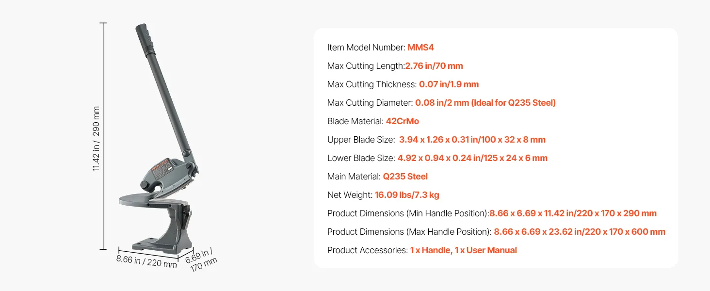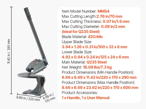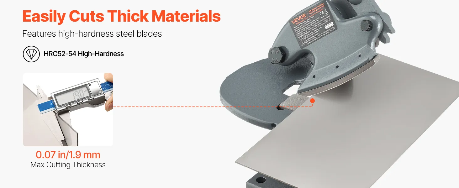 This sheet metal shear is ideal for cutting aluminum, stainless steel, and low-carbon steel into straight lines and curves. It features 42CrMo blades, with a max cutting length of 2.76 in, thickness of 0.07 in, and a round steel capacity of 0.08 in. The <0.07 mm gap ensures smooth, burr-free cuts.