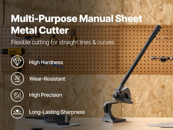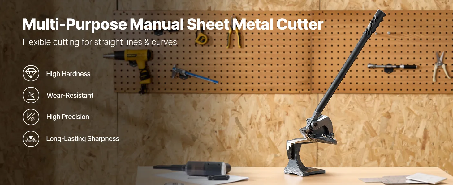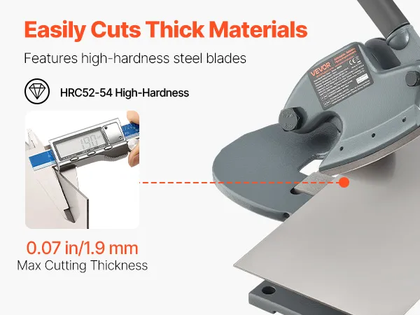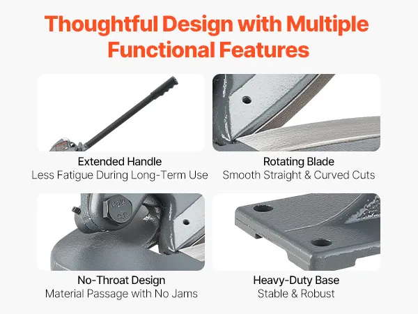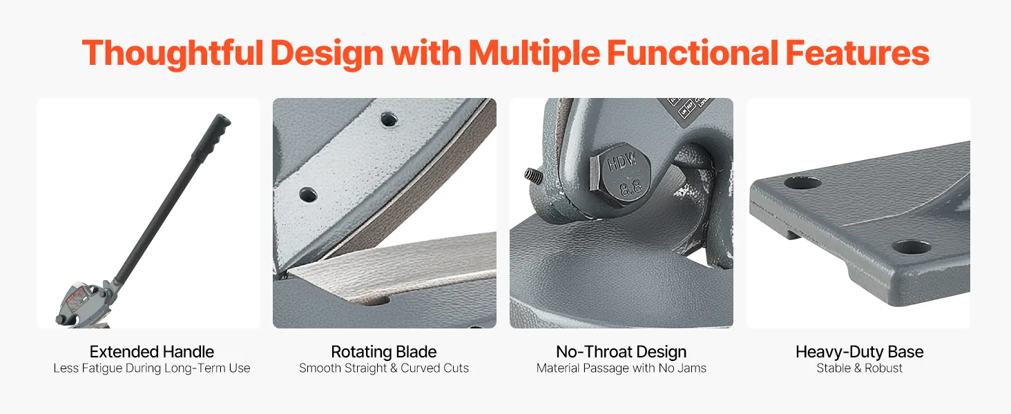 Our metal shear machine features an extended handle designed with leverage in mind for less fatigue. It includes a rotating blade for easy straight and curved cuts, a throatless design to reduce material jams, and a weighted base for enhanced stability during use.