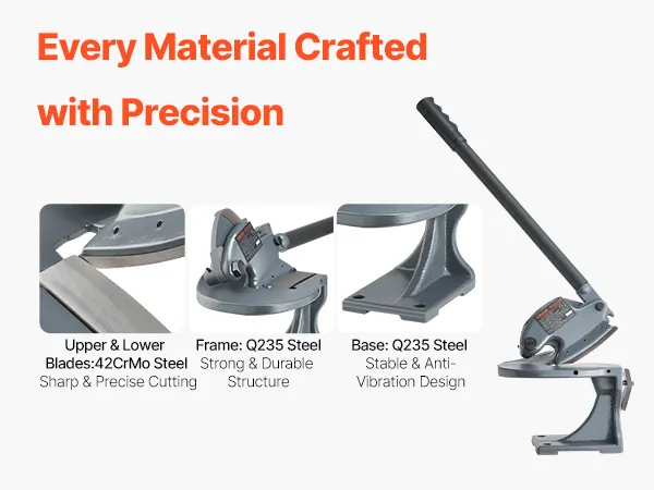 Our metal shear is made with 42CrMo upper and lower blades and a 42CrMo round blade, all heat-treated to HRC52–54 for sharpness. It's built to be tough and edge rolling-resistant. The Q235 steel frame and base provides stable support, reducing vibration and ensuring clean, precise cuts every time.