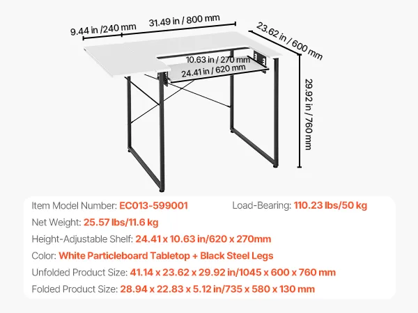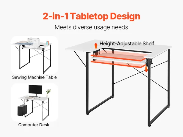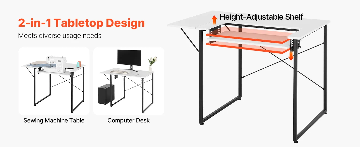 This folding sewing table works not only as a sewing machine table but also transforms into a computer desk, meeting your diverse needs. Its flexible shelf lets you quickly adjust the height based on different devices and usage scenarios, ensuring multiple uses to make your workspace efficient.