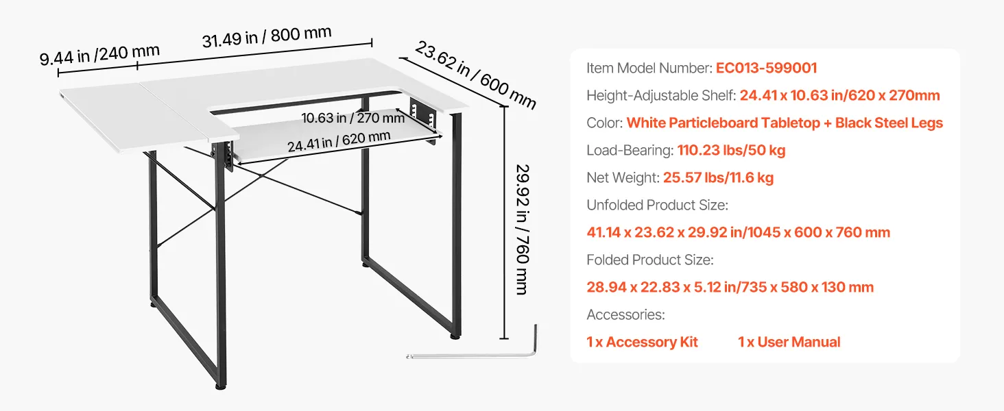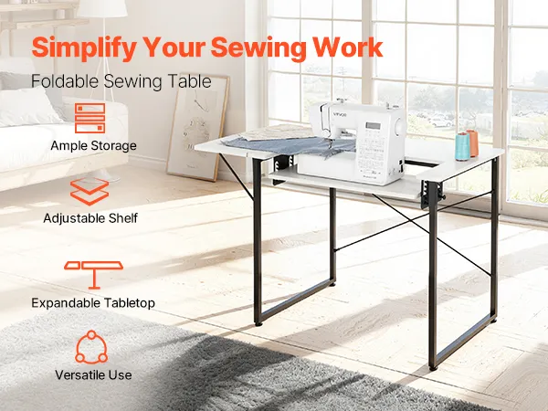 VEVOR Sewing Table, Multipurpose Sewing Machine Table with Foldable Side Shelf, Adjustable Shelf, Steel Legs, Computer Desk for Home, Fashion Studio, Art Studio, Educational Institution, White