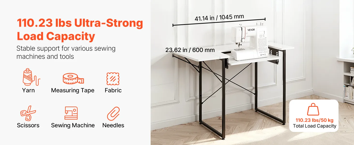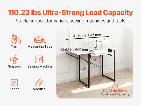 This sewing machine table delivers a strong load-bearing capacity of 110.23 lbs/50 kg, stably supporting large sewing machines and various tools. Its spacious work surface provides ample operating space, easily accommodating yarn, fabrics, scissors, sewing machines, and pins.