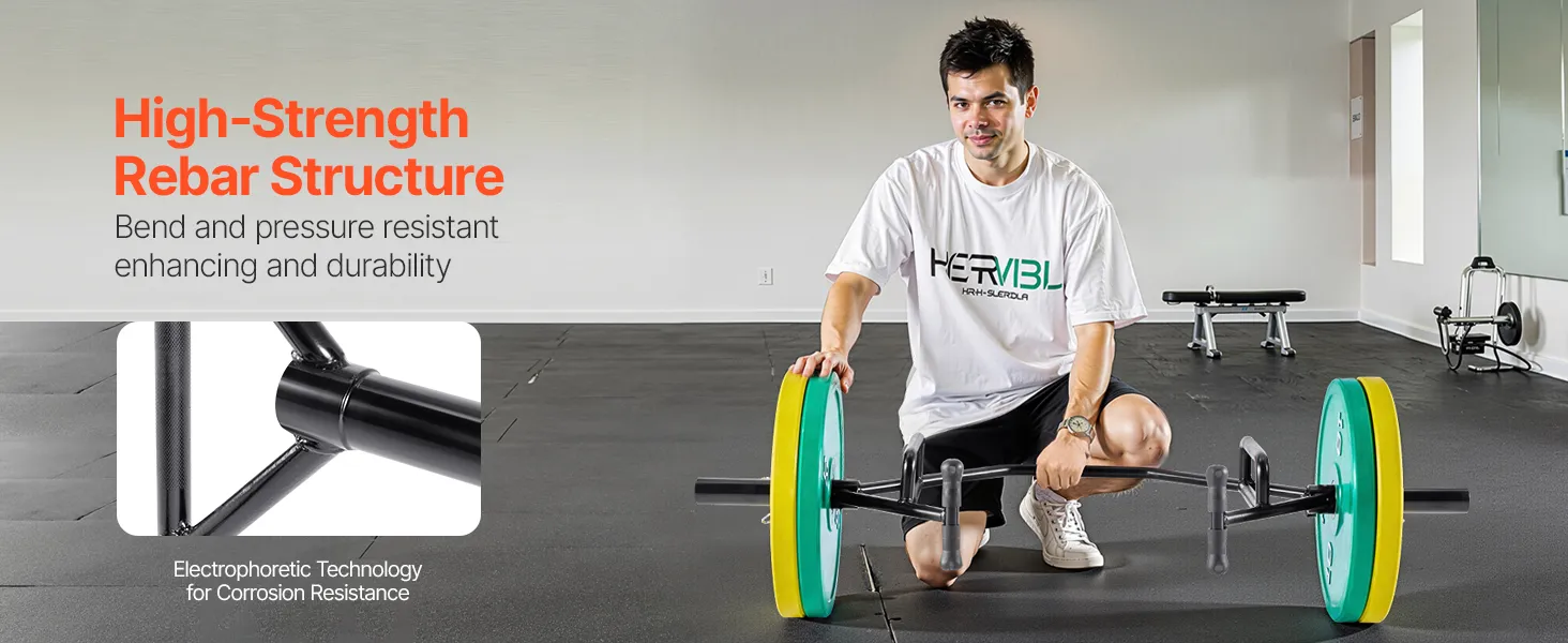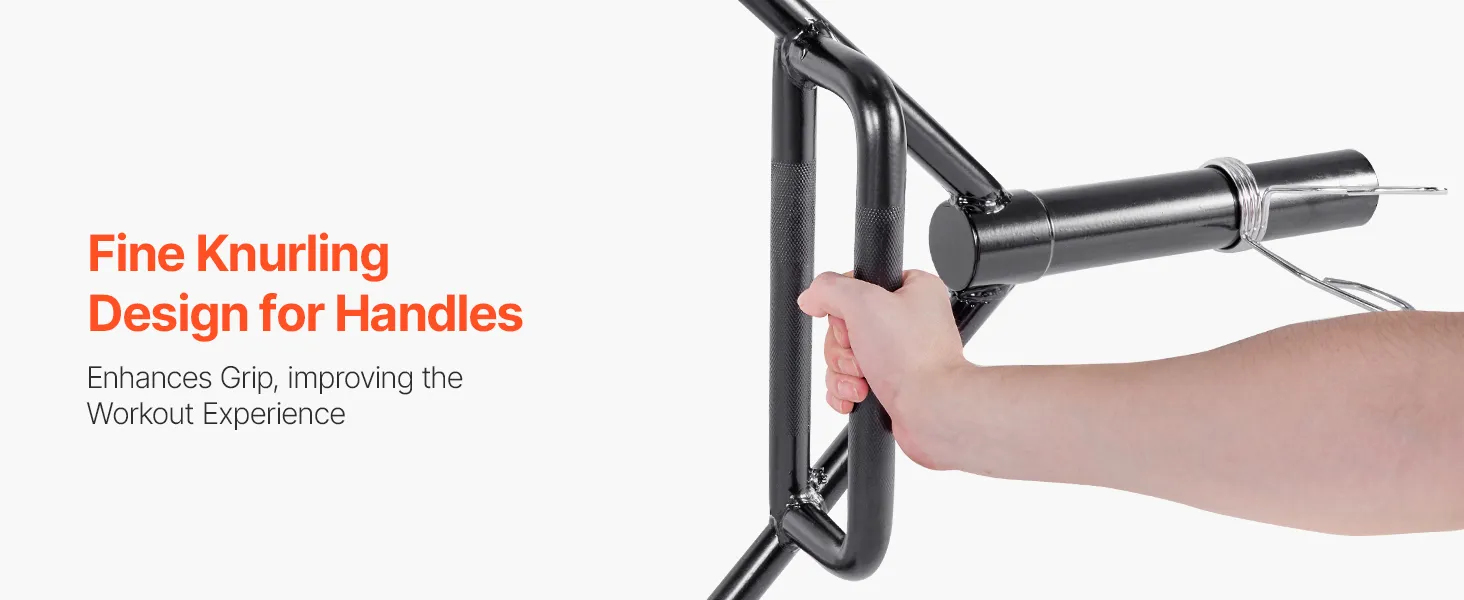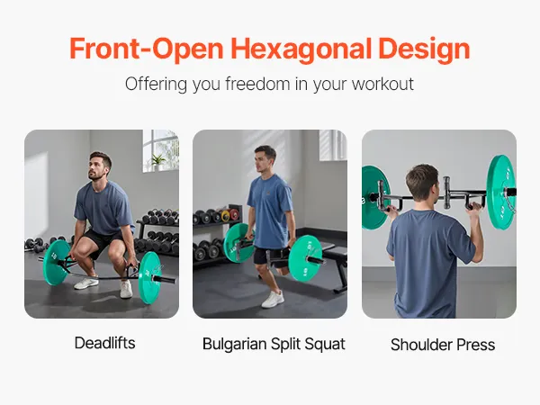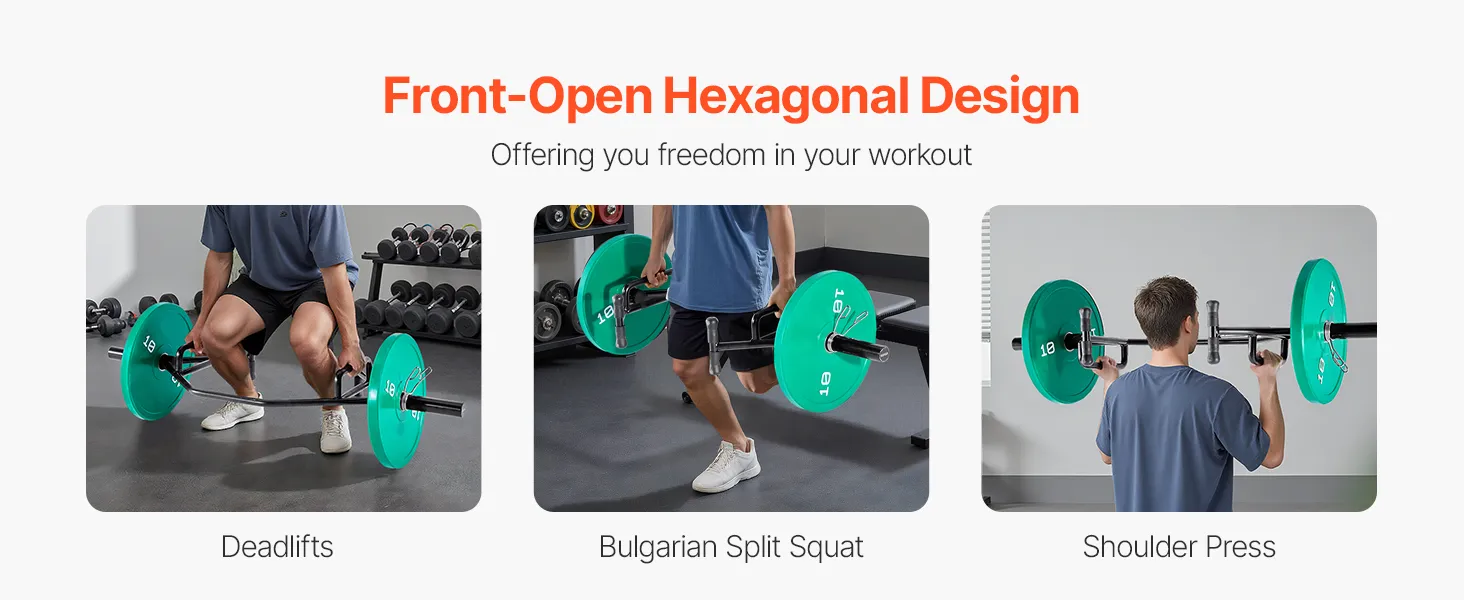 • Open-Frame Design: This trap bar features a front-open hexagonal frame that offers greater freedom of movement. Ideal for shoulder presses, split squats, Romanian deadlifts, and lunges, whether you train at home or in a professional gym