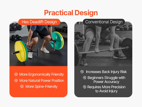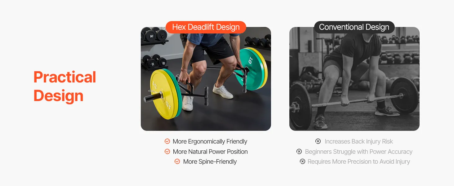 • Humanized Design: Ergonomic knurled handles with a non-slip texture ensure a secure grip during squats, deadlifts, shrugs, and farmer’s walks. Integrated foot supports make loading plates easier. The hex shape helps align your lifting position