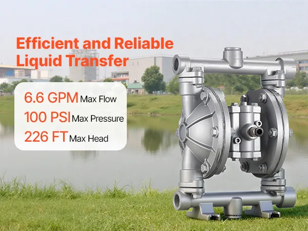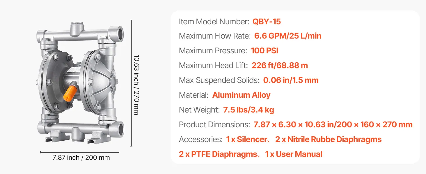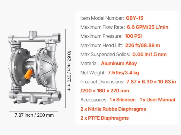 Featuring PTFE diaphragms and a fully bolted structure for a secure seal and long-lasting reliability. With a 6.6 GPM max flow rate, 226 ft max head lift, and standard port size, it efficiently transfers waste oil, not suitable for corrosive acids/alkalis or liquids above 140℉/60℃.