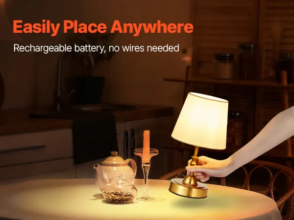 VEVOR Cordless Table Lamp, 5200mAh Built-in Rechargeable Battery Small Desk Lamp, 3-Level Brightness, Fabric Shade, 2700-3000K Color Temperature, Table Light for Restaurant, Bedroom, Bars, Gold