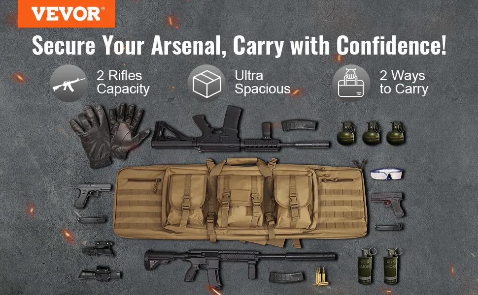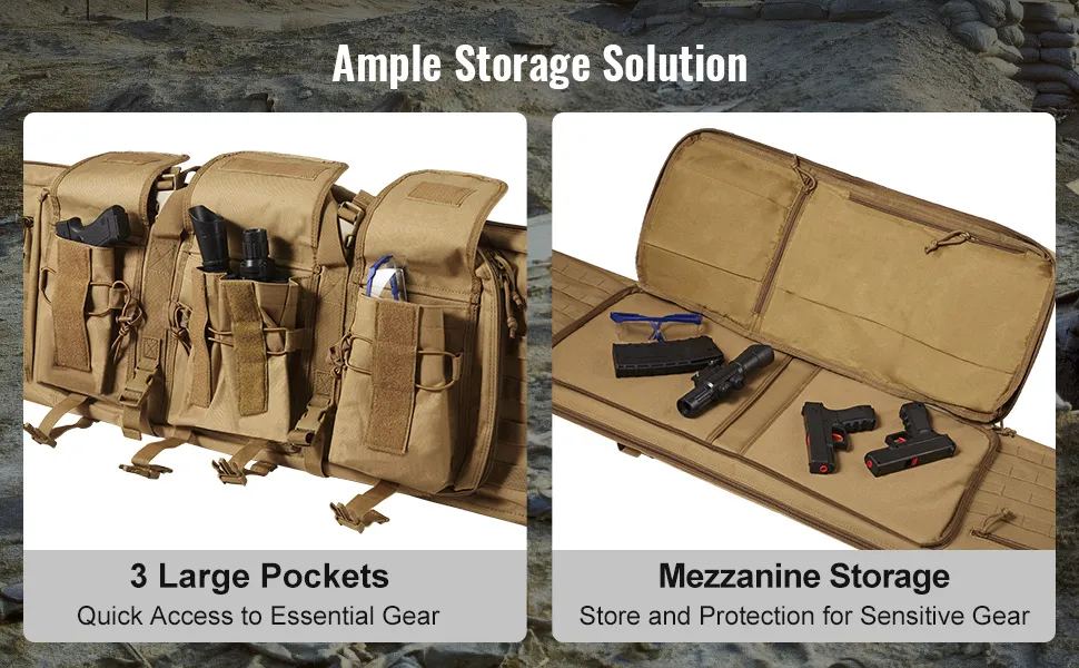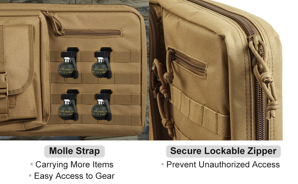 • Molle Grid & Lockable Zipper: Our double rifle bag features a Molle system, allowing you to attach additional tactical pouches and gear. The lockable zipper puller adds extra security, preventing unauthorized access to your firearms and valuable gear.