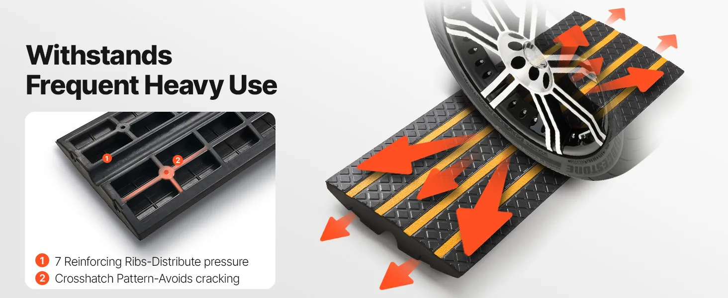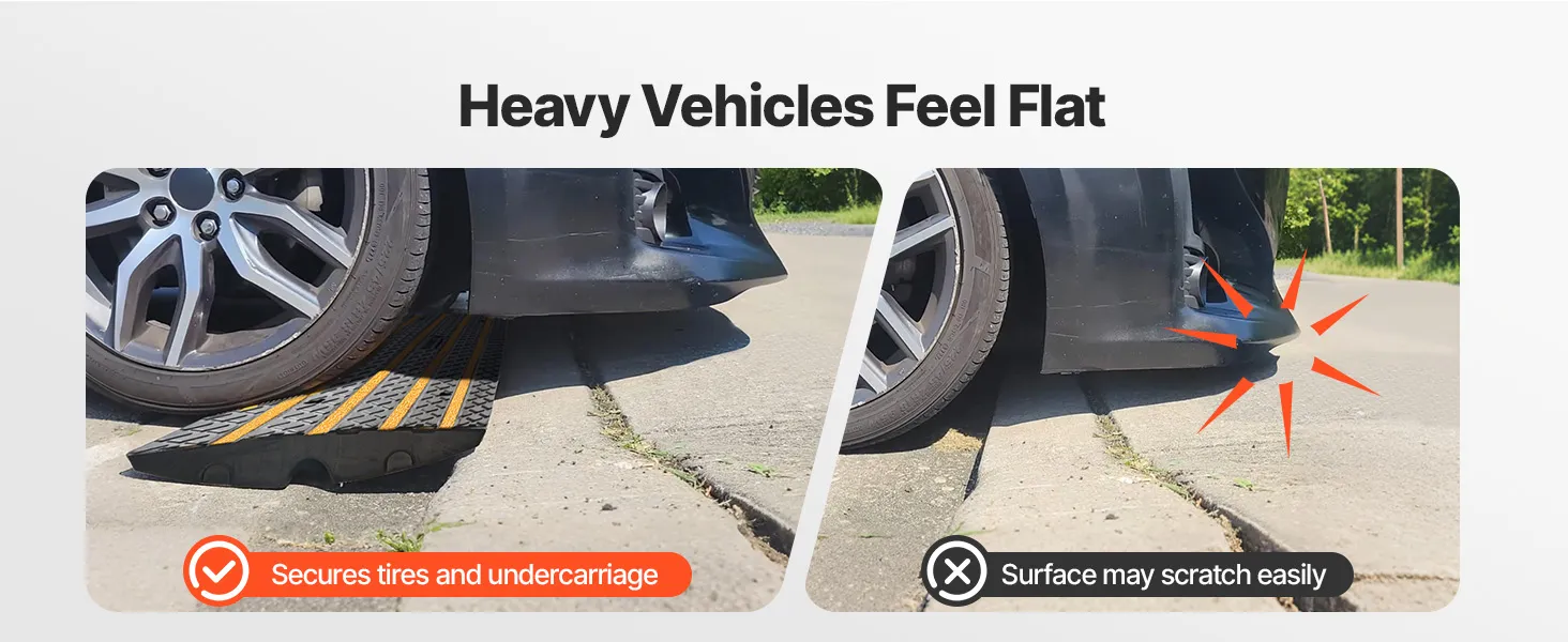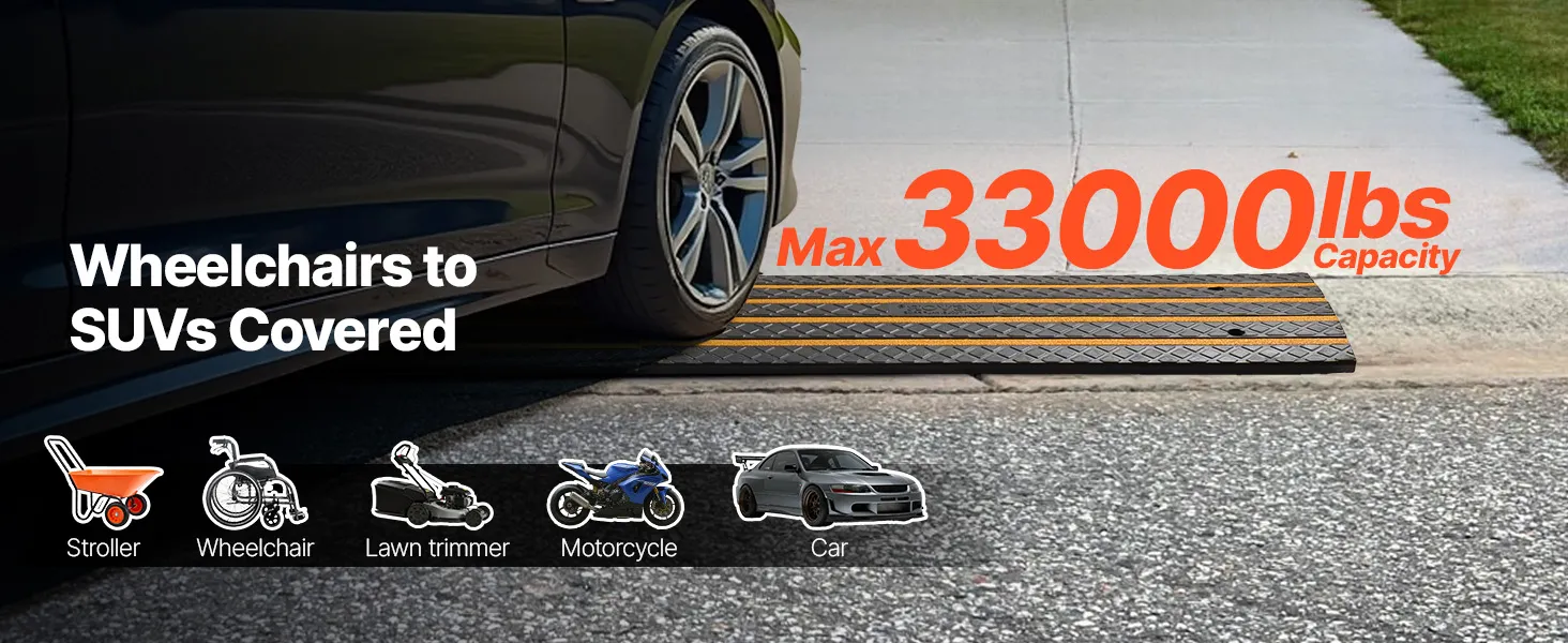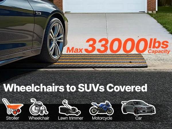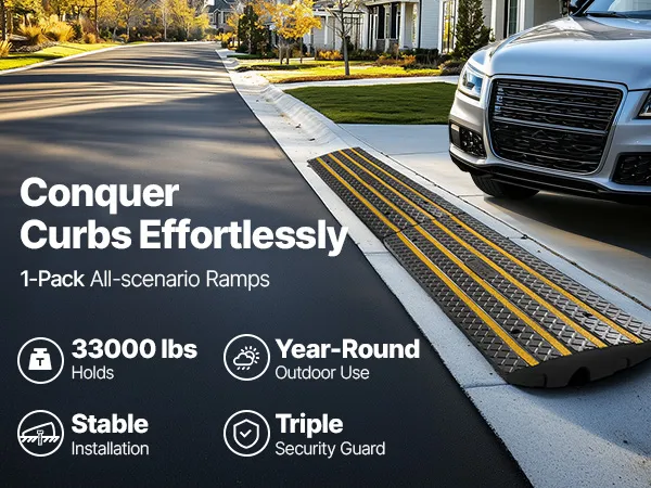 This curb ramp supports up to 15 tons, helping pickups and SUVs enter garages smoothly without tire or undercarriage damage. Curbs and steps feel flat and easy to cross.