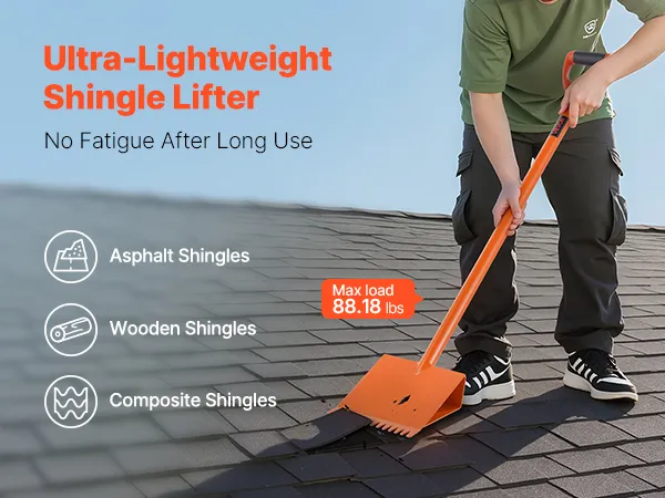 This lightweight roof ripper features an ergonomic PP handle for fatigue-free use. The 8-inch wide blade is made of heat-treated 45# steel, capable of supporting up to 88.18 lbs. Ideal for stripping asphalt, wood, and composite shingles in roof demolition.