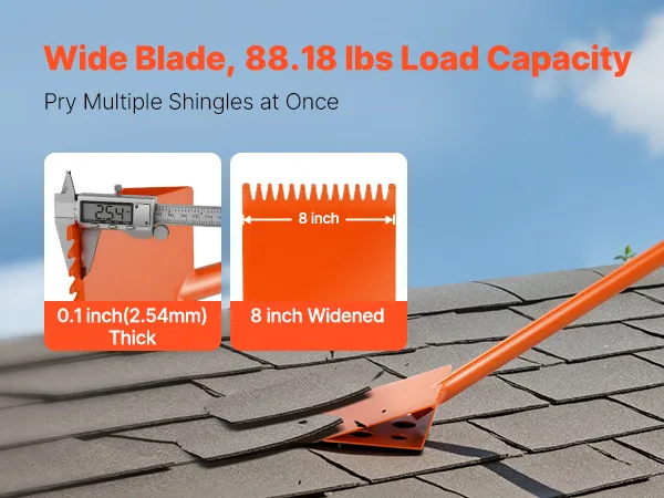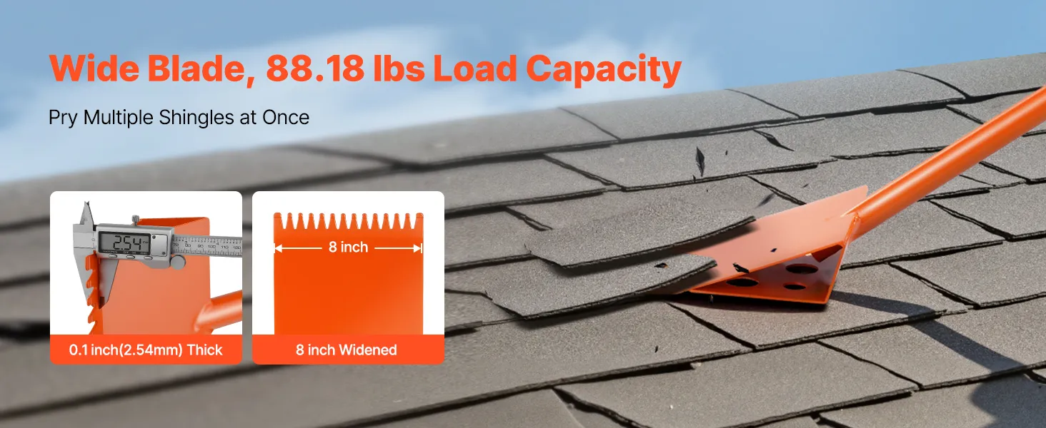 With an 8-inch wide, 0.1-inch thick blade, this tearing off roofing tool supports up to 88.18 lbs, allowing multiple shingles to be cleaned at once. It saves time and labor, increasing efficiency in demolition tasks.