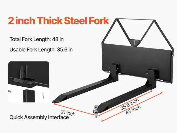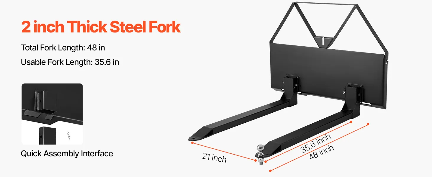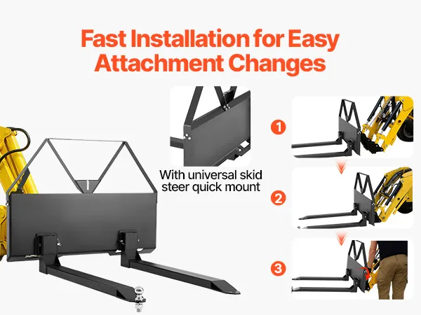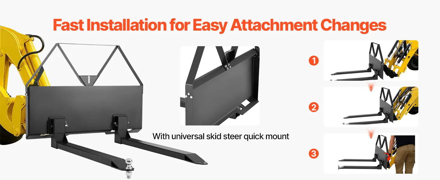 • Quick Installation: No tools required! The universal pallet forks frame attachment fits most loaders, tractors, and skid steers. Install quickly and easily for more efficient work
