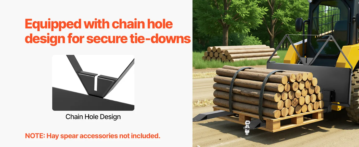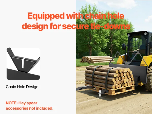 • Chain Hole Design: The mounting plate has chain holes, so you can easily secure items with ropes or chains. This design of our quick attach pallet forks boost stability and keep items from falling during transport—security first