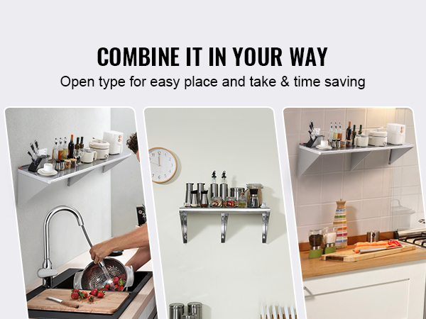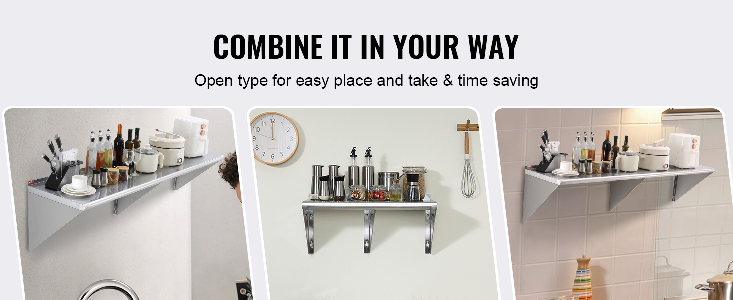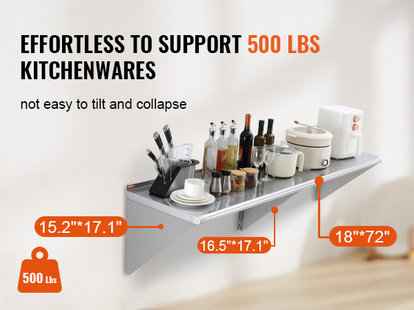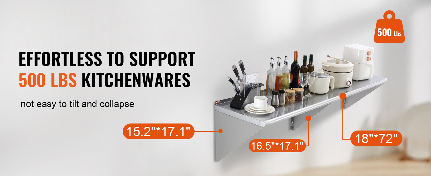 Our stainless steel shelf excels at organizing condiments and heavier items and holds up to 500 lbs. Triangular brackets maximize the stability and security of the metal wall shelf.