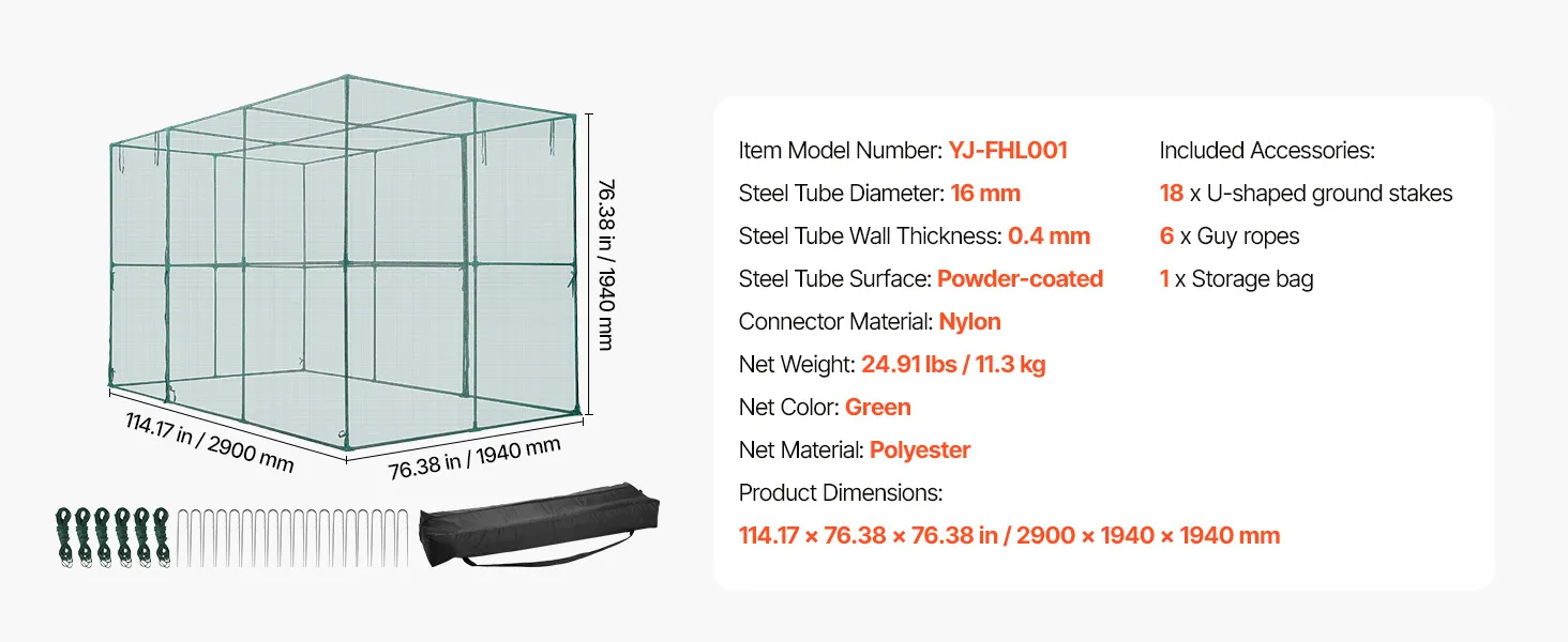 VEVOR Crop Cage, 2.9 x 1.94 x 1.94 m Plant Protection Tent with Zippered Door, Wind-Resistant Tall Crop Cage, Easy to Install, Outdoor Raised Bed Cover, Tomato Plant Netting for Garden Patio Lawn
