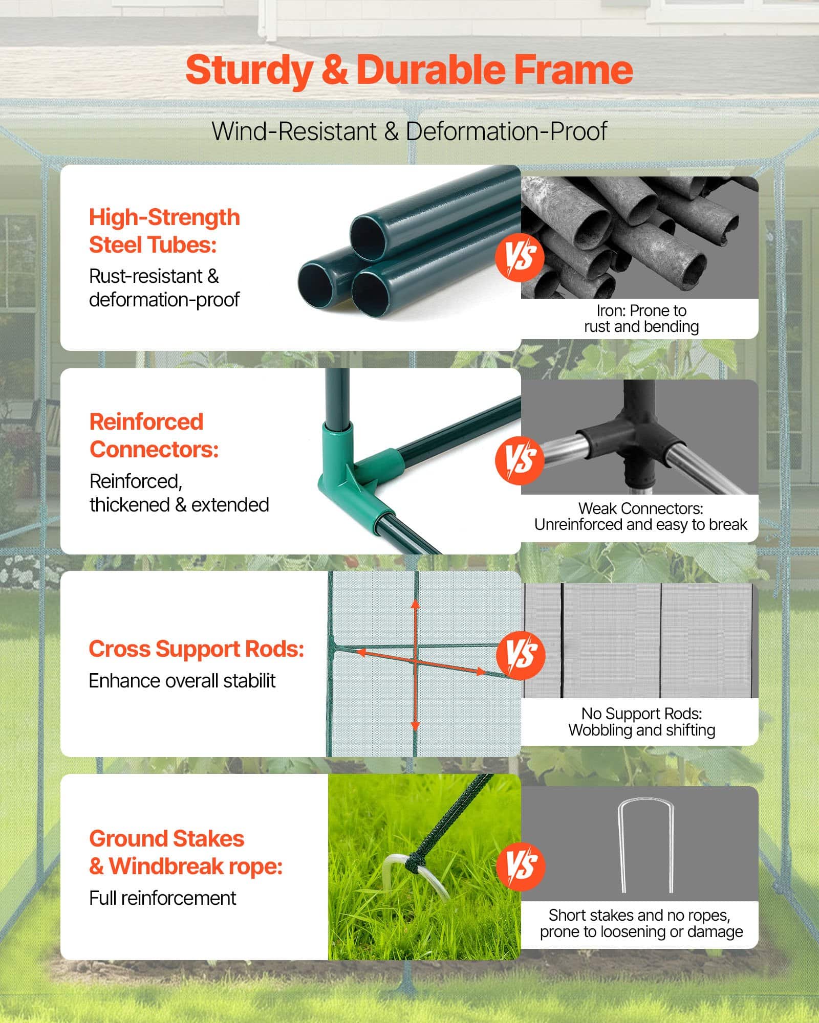 When the tall crop cage gets dirty, simply rinse it with water and air-dry. To ensure long-term stability, please regularly check all fixing parts. Reinforce or replace immediately if loosened or damaged.