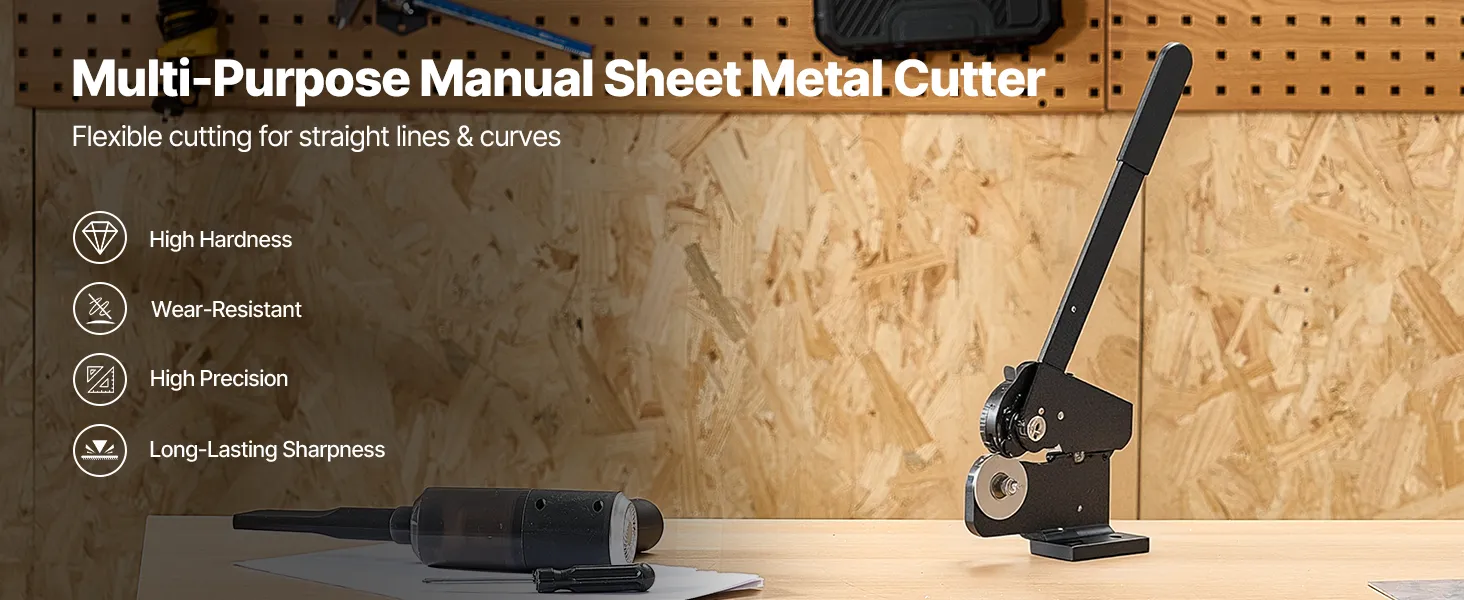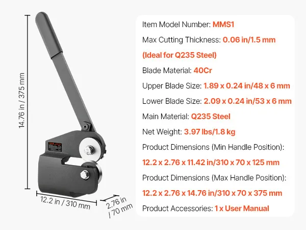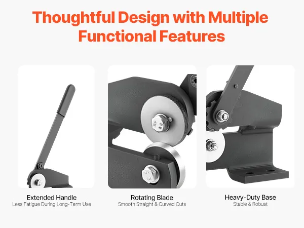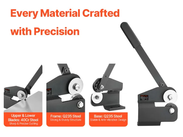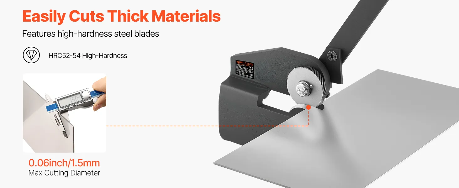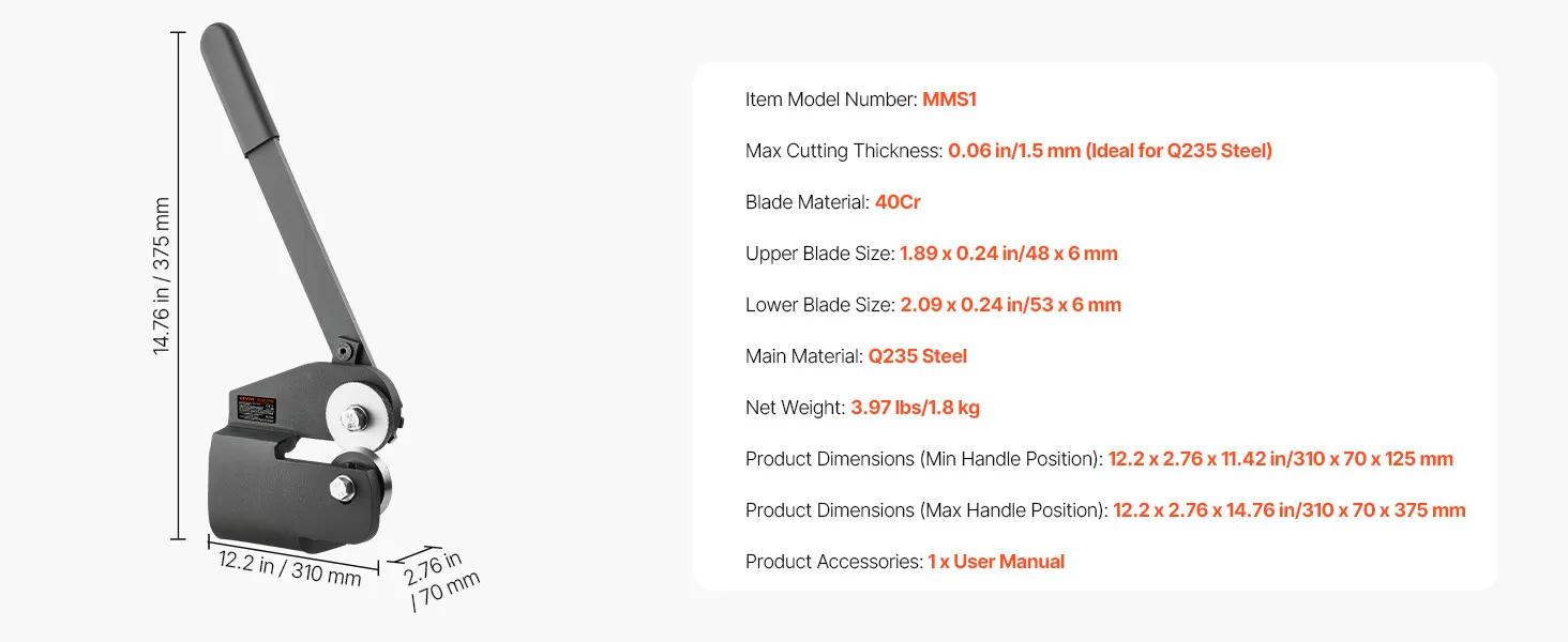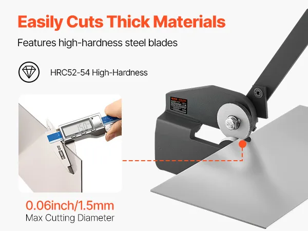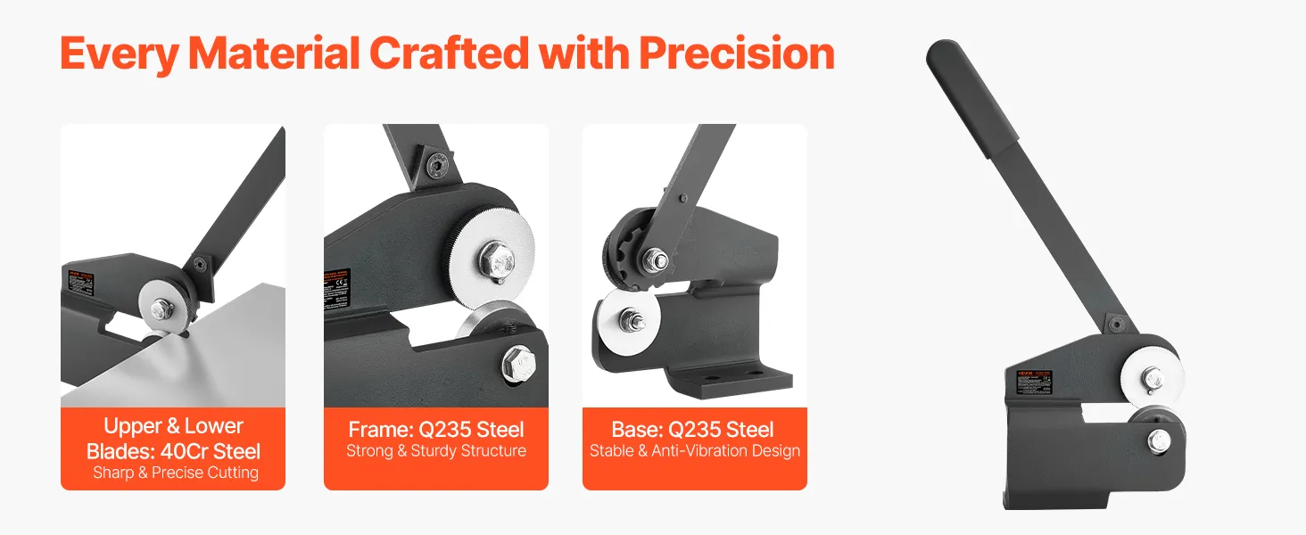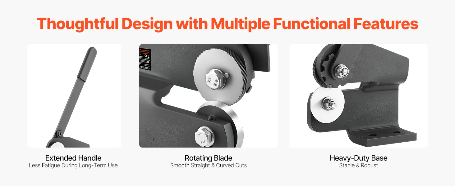 • Versatile Cutting: This sheet metal shear easily cuts straight lines, curves, and more complex shapes to meet diverse cutting needs. With a max thickness capacity of 0.07 in, it’s ideal for various materials