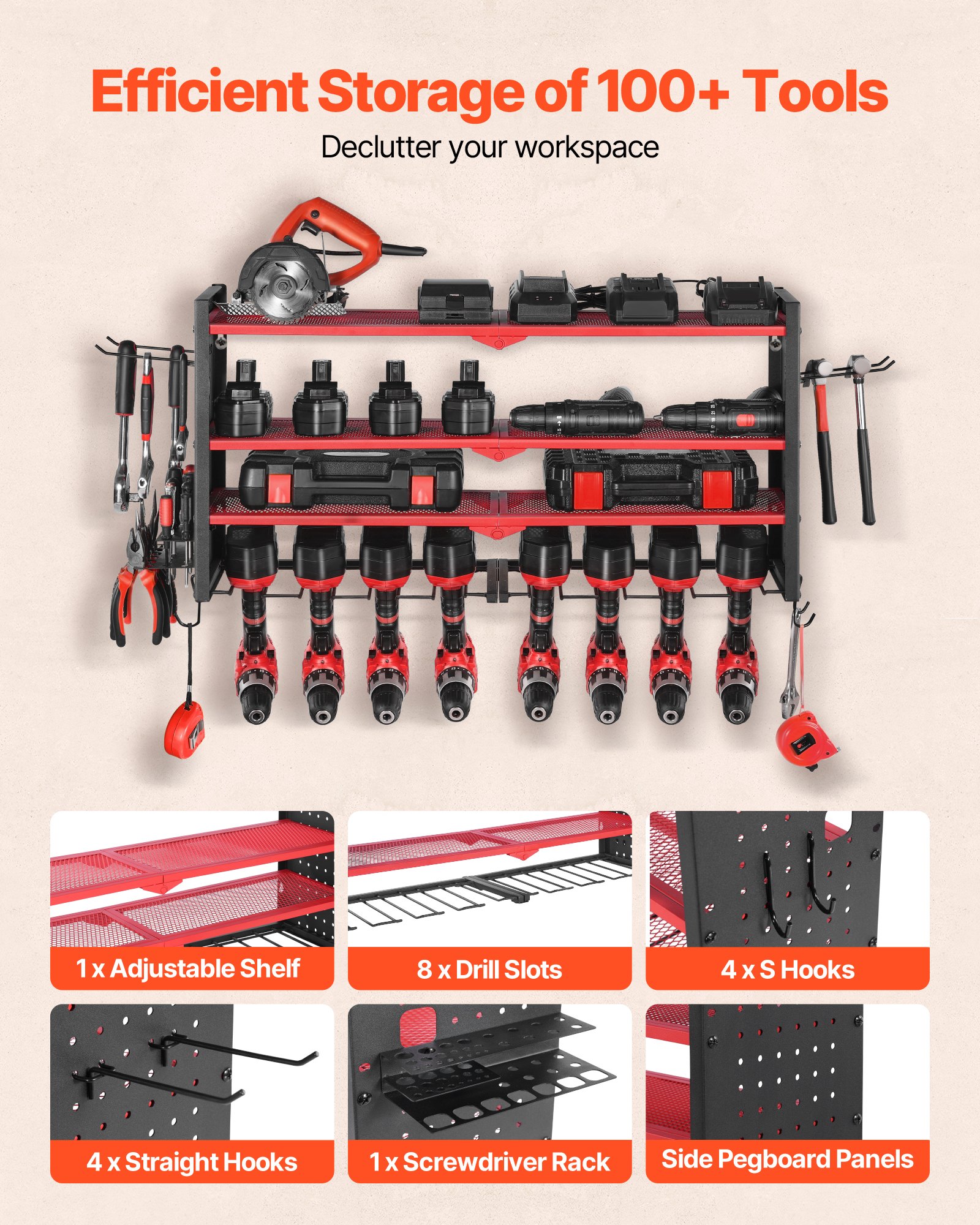 • Efficient Storage: This 4-tier wall-mounted power tool rack (32.87 x 8.66 x 16.54 in) has an adjustable middle shelf, 8 drill slots, pegboard sides, S-hooks, and straight hooks to keep tools neat and handy
