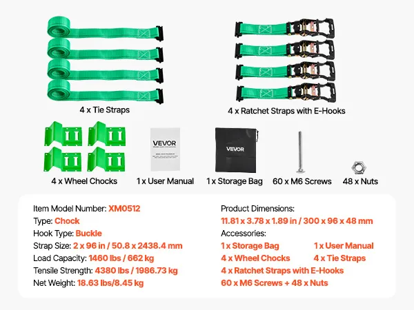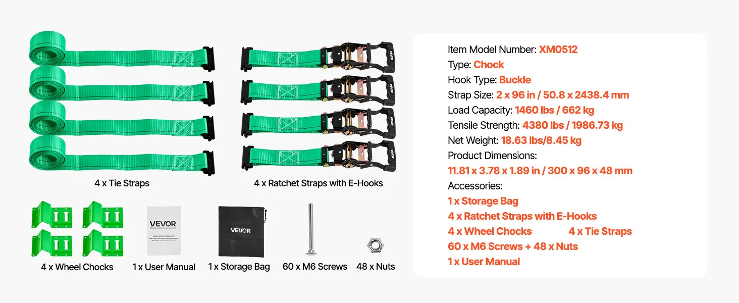 • Tire-Friendly Design: Featuring soft materials and rubber blocks that directly touch the tire, our ratchet strap minimizes friction and pressure, ensuring your tires and rims remain undamaged during transport. The kit includes 4 sets of solid ratchets, 4 sets of 96-inch/2430mm webbing, and 4 sets of wheel chocks