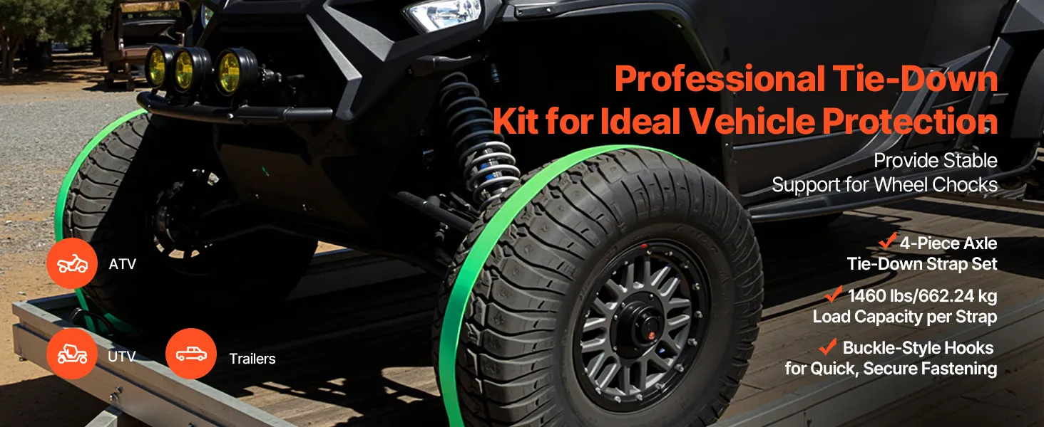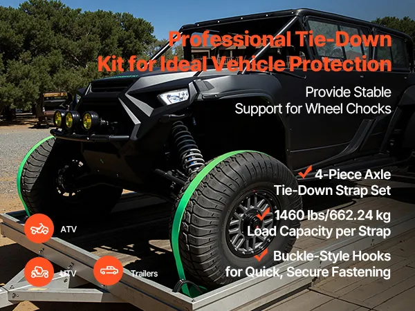 Комплект фіксації коліс VEVOR для ATV/UTV, ремені 2430мм, міцність 1986кг, навантаження 662кг, E-гачки, система з пряжками