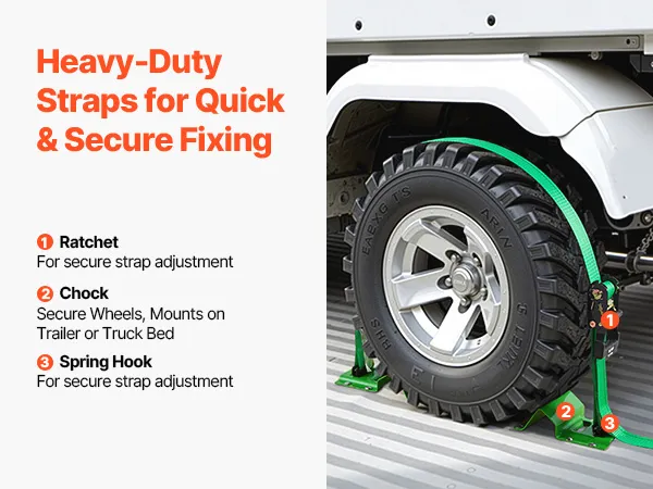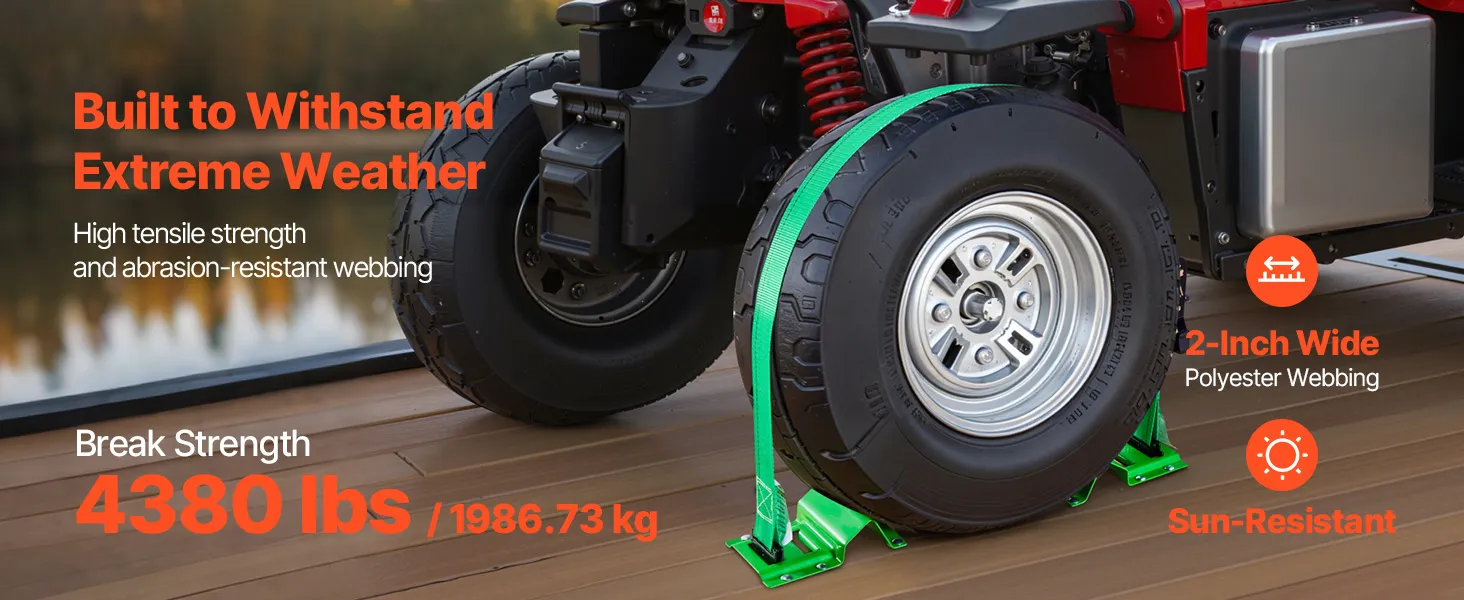• Versatile Tie-Down Kit: As a wheel chock kit, our ratchet strap comes with a 2-inch/50.8mm wide, 96-inch/2430mm webbing, with multiple shoulder straps that provide fixation for multiple wheels. It easily fits various vehicles— ATVs, UTVs, and trailers