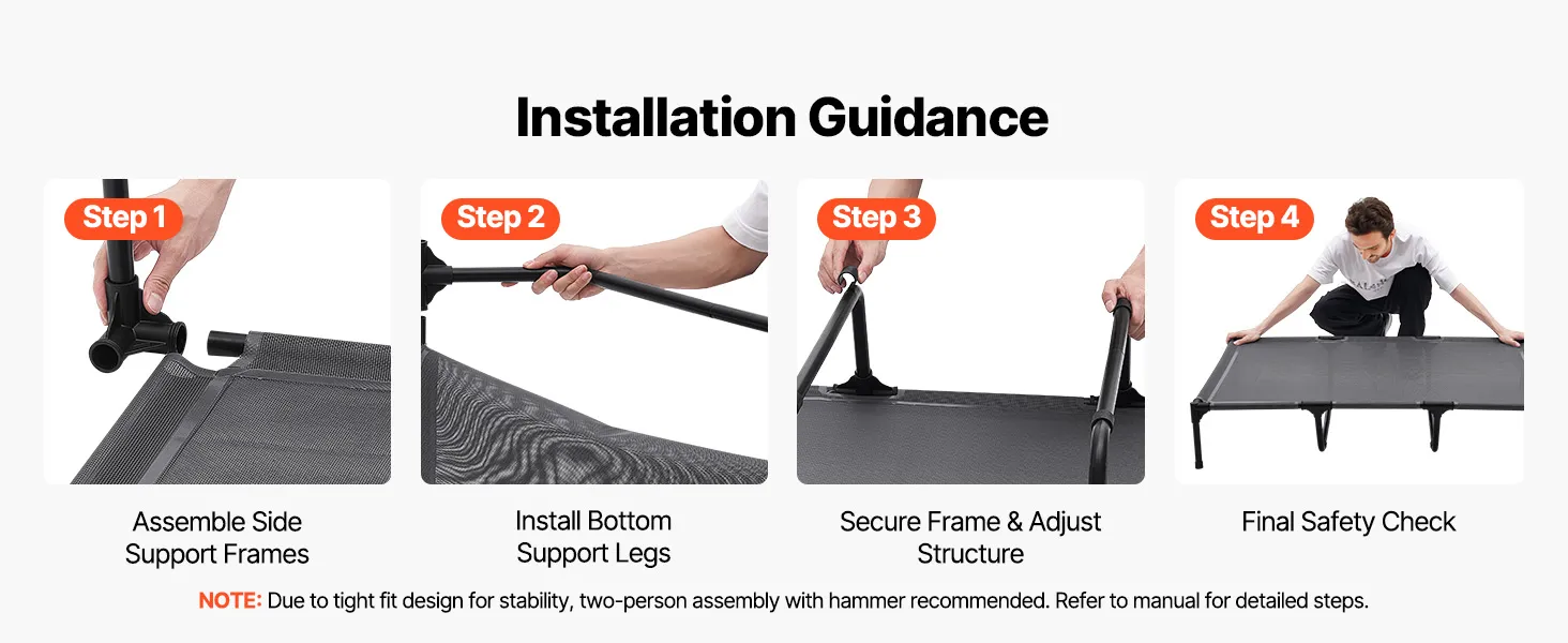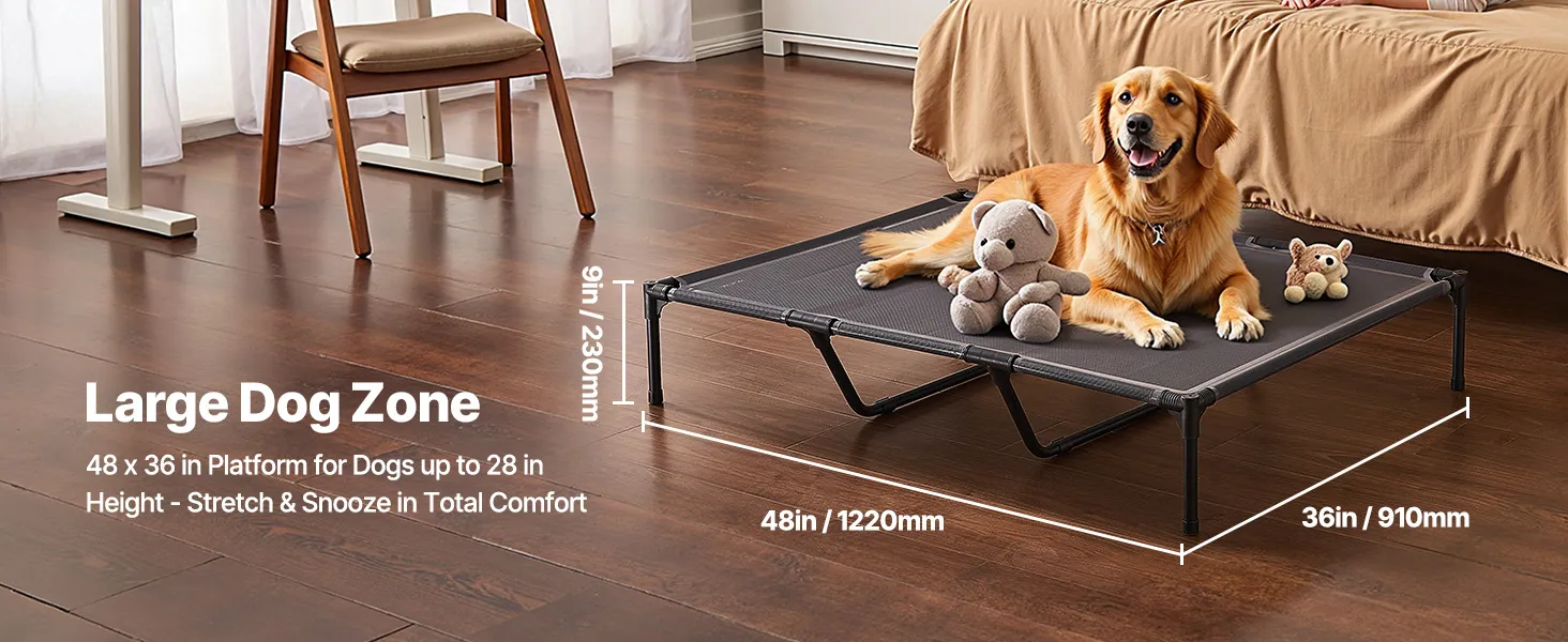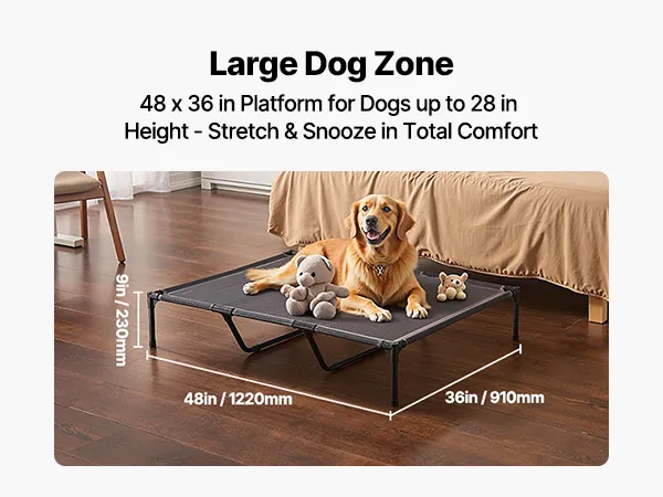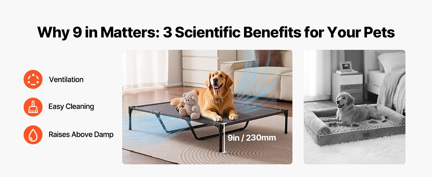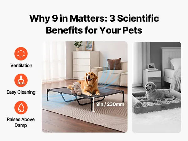 • Tool-Free Quick Assembly: Comes with clear assembly instructions, allowing you to set it up in just 10 minutes. New pet owners can easily assemble it too. The 9 in / 230 mm elevated height keeps your pet off the ground, isolating them from moisture, dust, and cold temperatures. It provides cooling airflow in the summer and can be paired with a blanket in winter for warmth